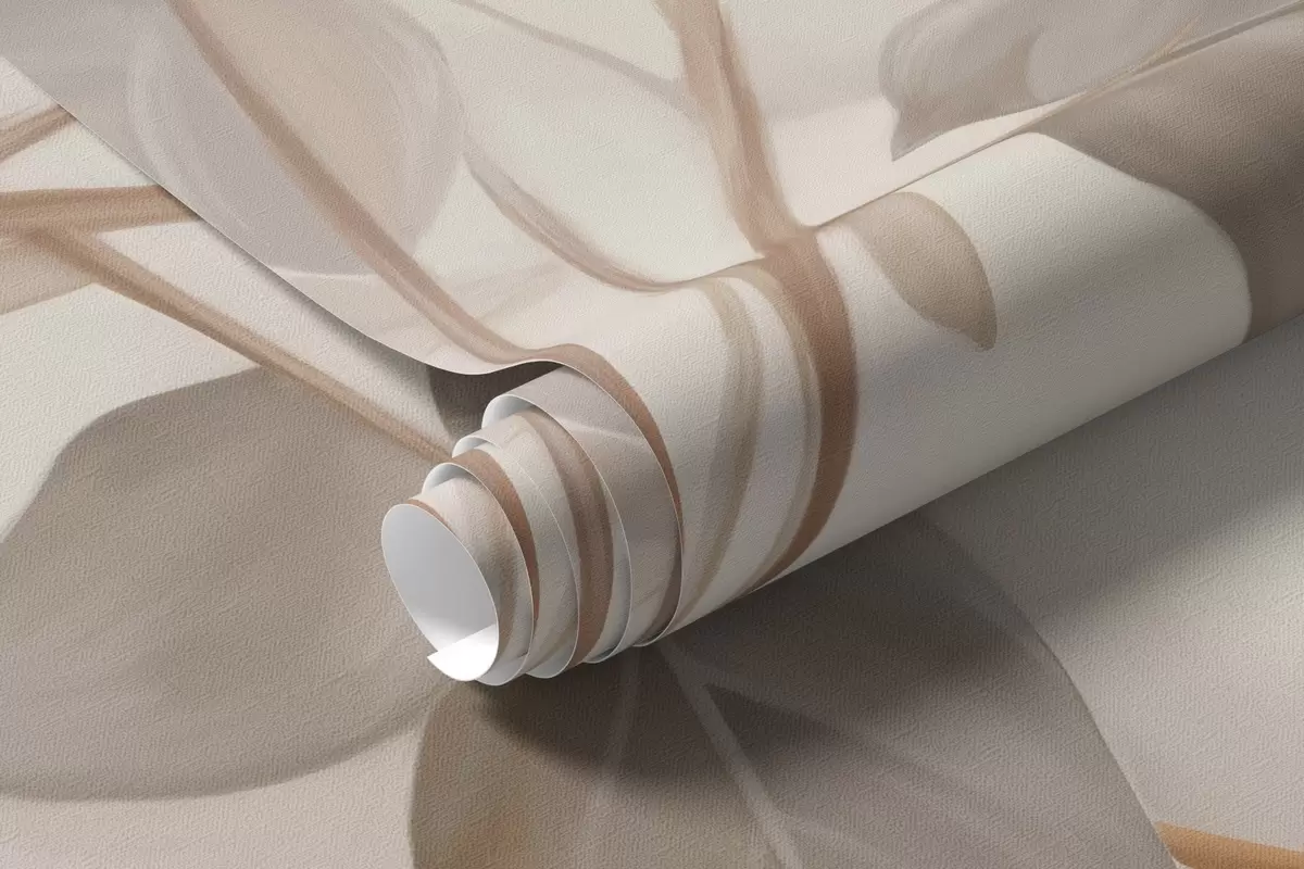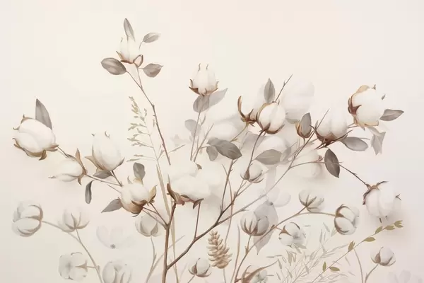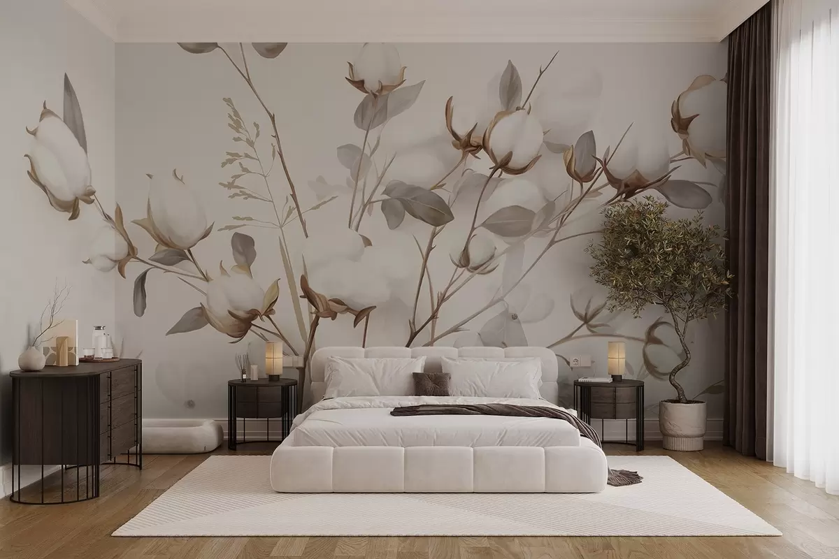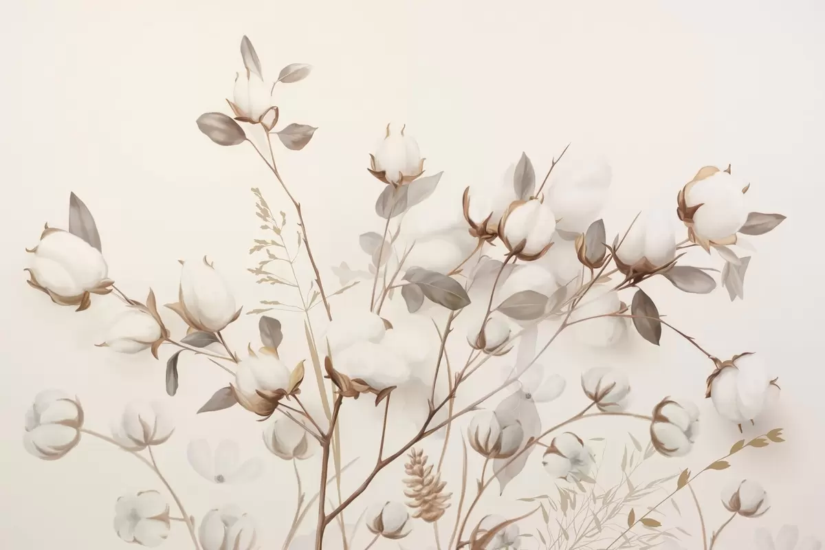Peintures murales Fleurs de coton avec tiges et feuilles dans une palette de couleurs marron clair, fond beige, doux et délicat, style aquarelle Nr. w09141