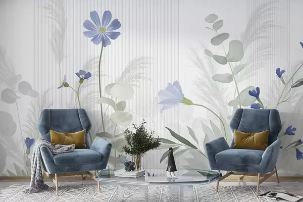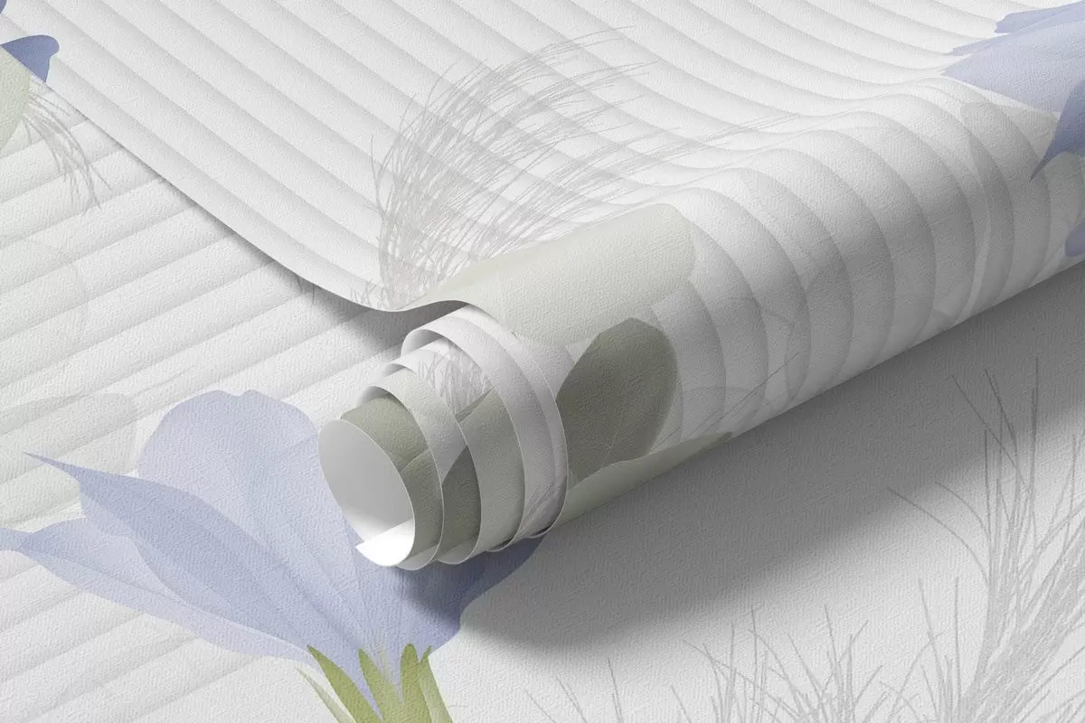 Peintures murales Fleurs aux couleurs pastel, feuilles vert clair, fond blanc avec lignes verticales, élégant et minimaliste Nr. w09161v1
