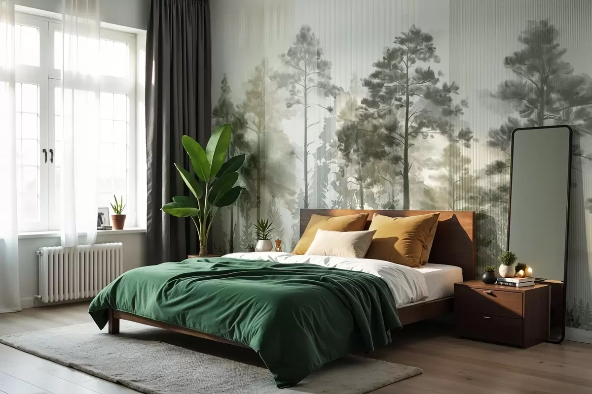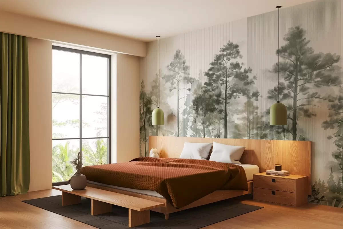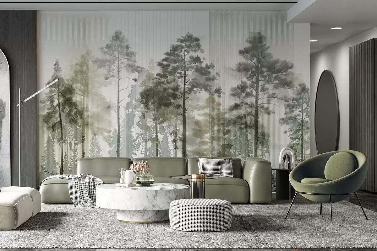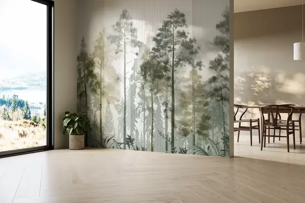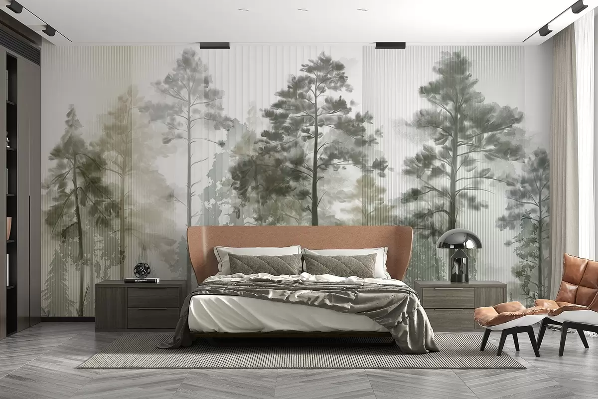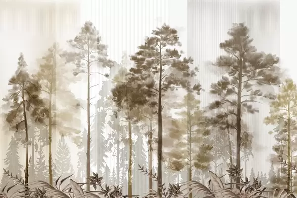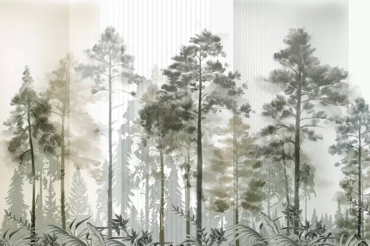 Peintures murales Une forêt dense avec de grands pins, un feuillage vert luxuriant, une atmosphère brumeuse avec des textures de lignes verticales Nr. w09163