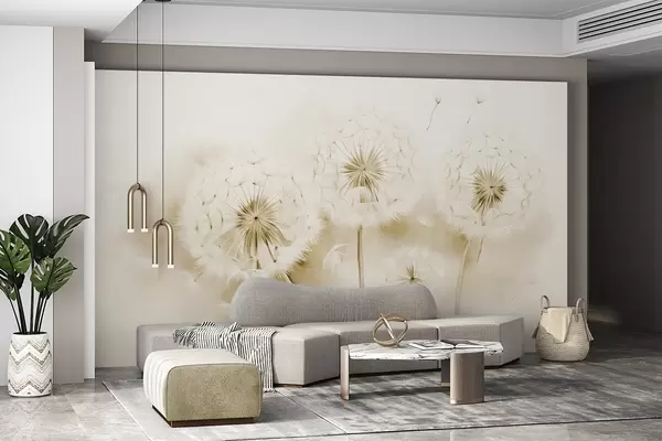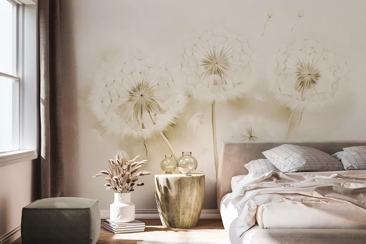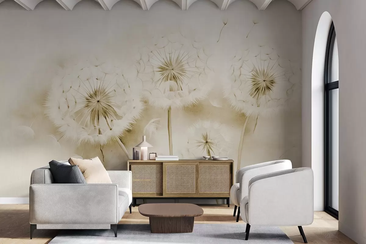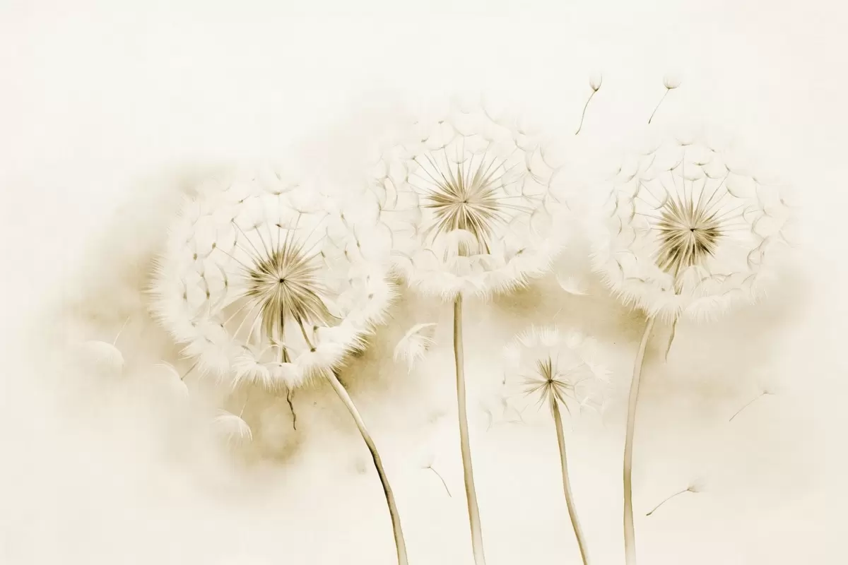 Peintures murales Pissenlits texturés avec des graines flottant dans l'air, fond jaune et blanc, style de dessin doux et délicat Nr. w09190v1