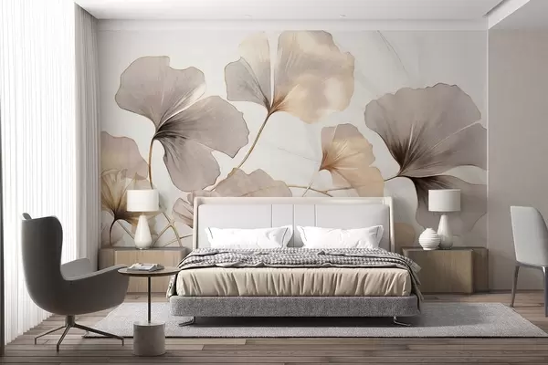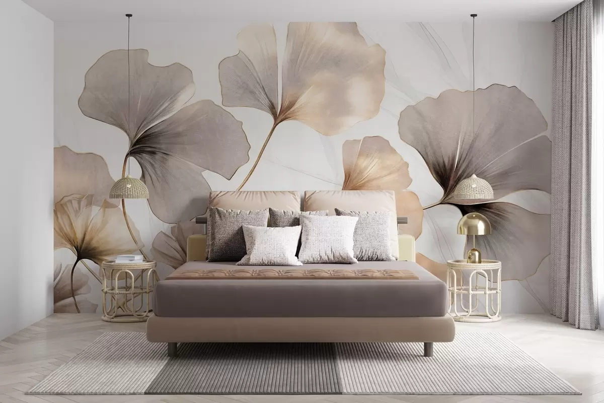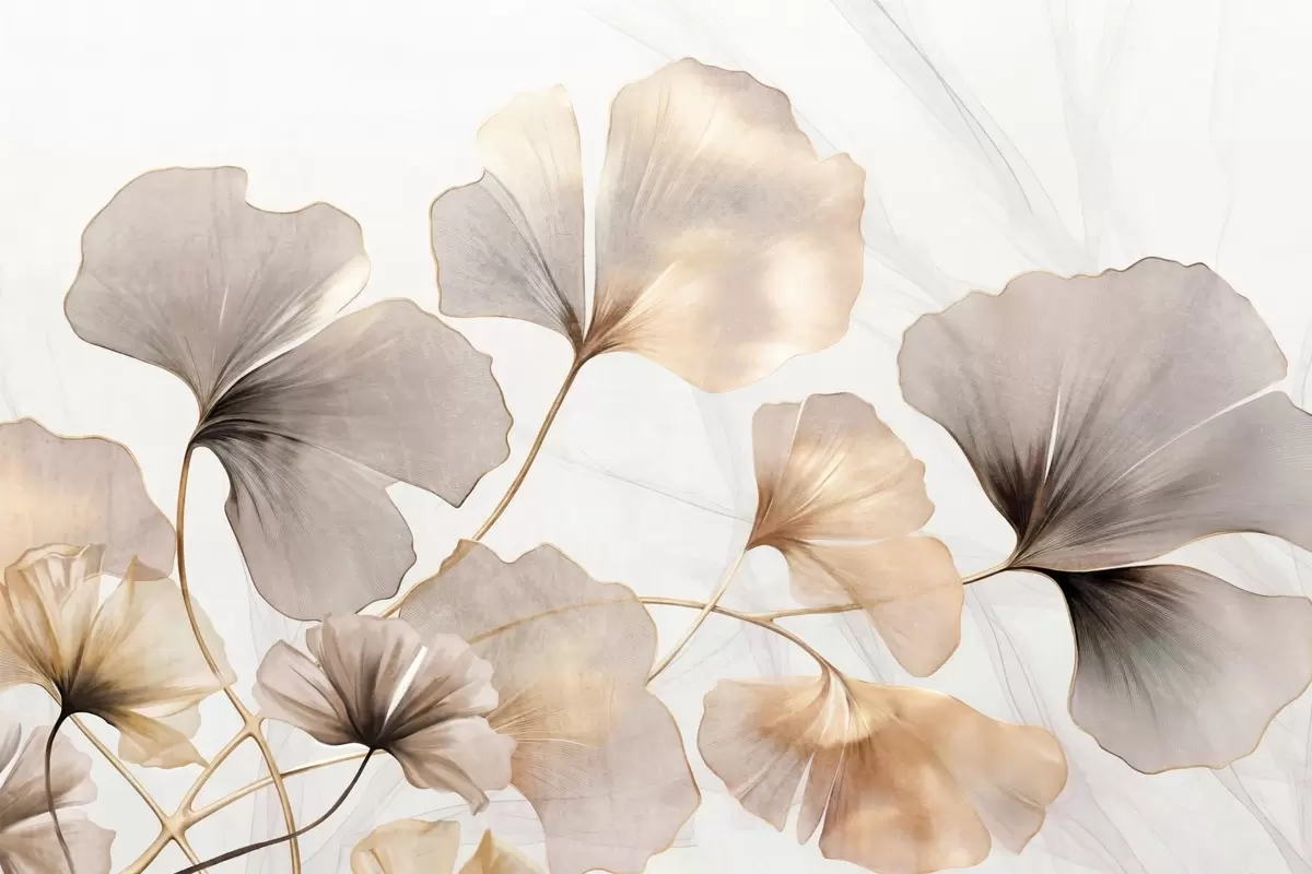 Peintures murales Feuilles de Ginkgo biloba dans les tons beige, jaune et brun, effet aquarelle délicatement texturé, fond clair Nr. w09215