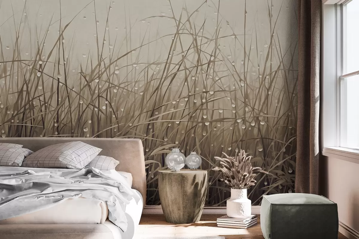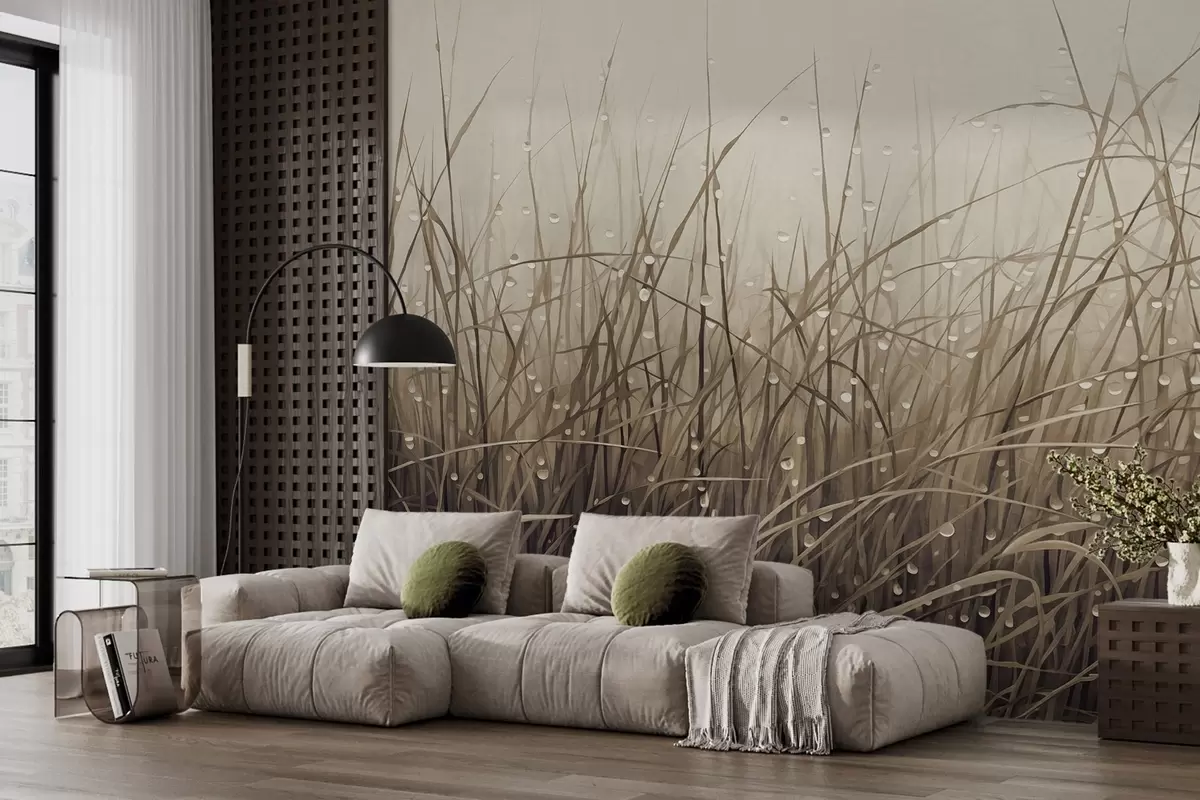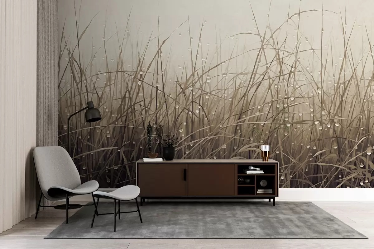 Peintures murales Herbe avec gouttes d'eau, tons bruns atténués, lumière douce, arrière-plan brumeux, style abstrait minimaliste texturé Nr. w09217v1
