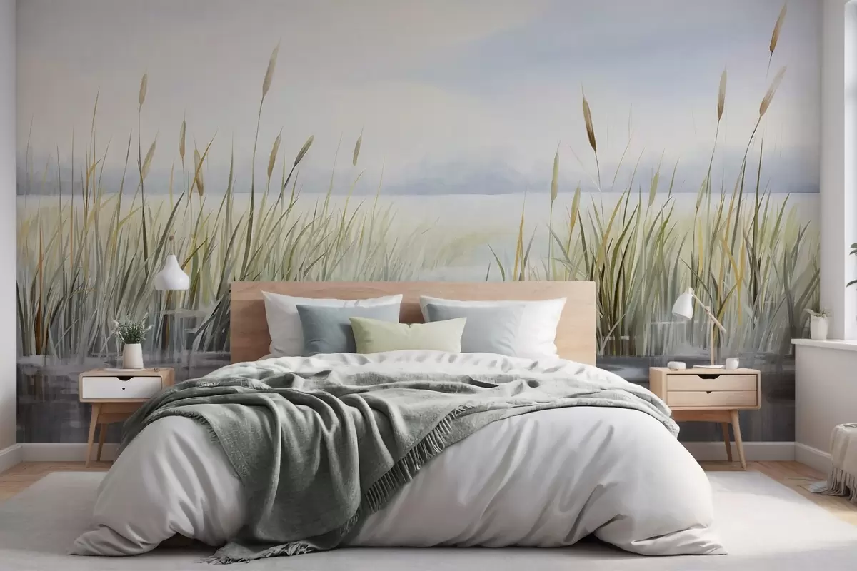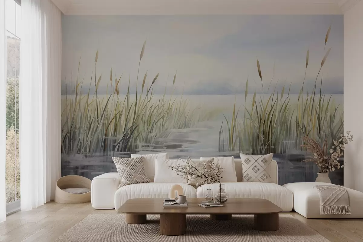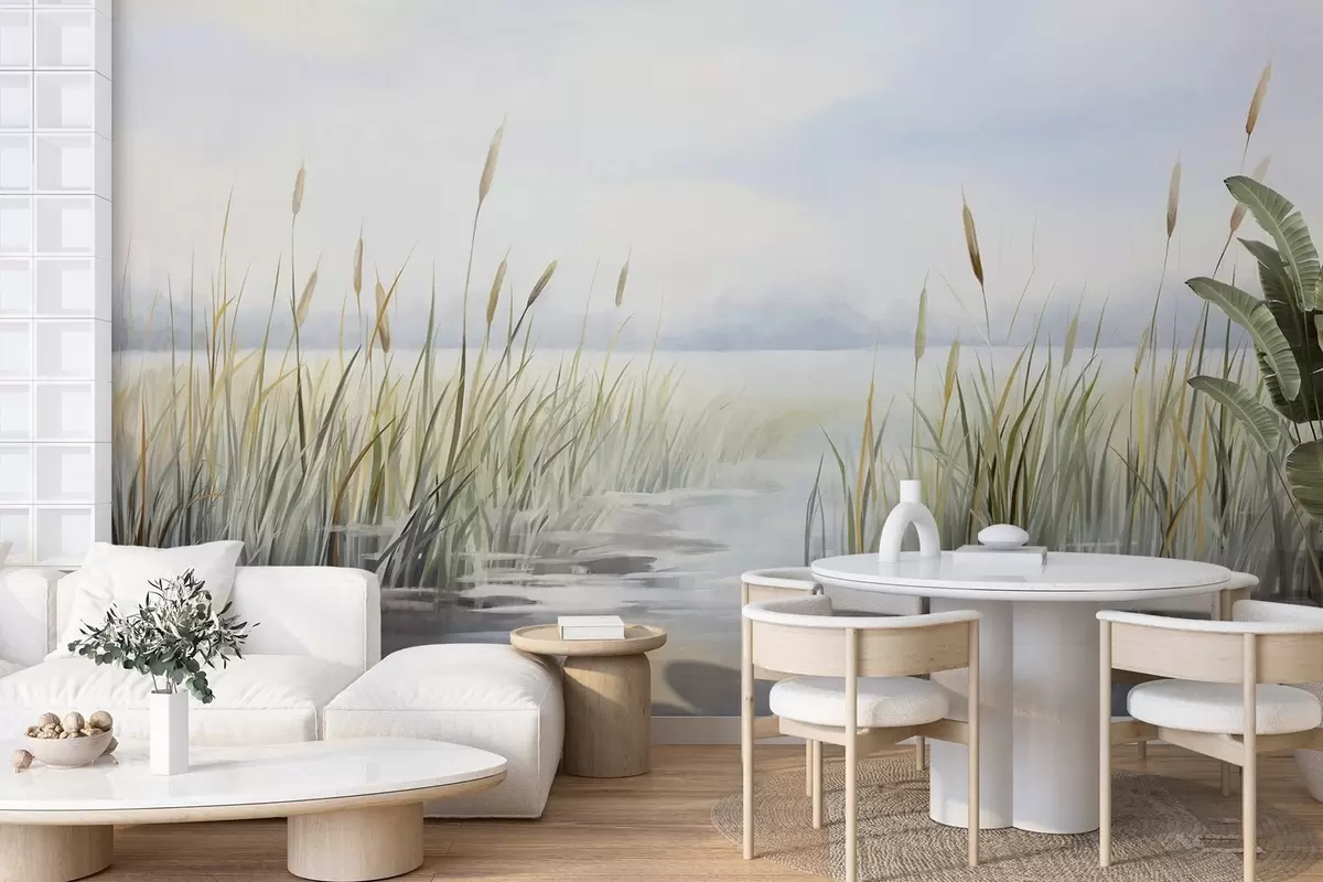 Peintures murales Une peinture aquarelle texturée imitant un paysage avec un lac, de l'herbe, un ciel couvert et un arrière-plan flou Nr. w09219