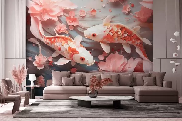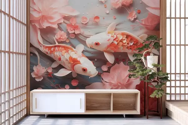 Peintures murales De délicats poissons aux écailles dimensionnelles nagent dans un flux de pétales et de tons roses doux Nr. w09237