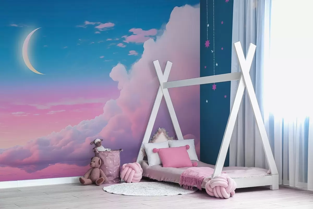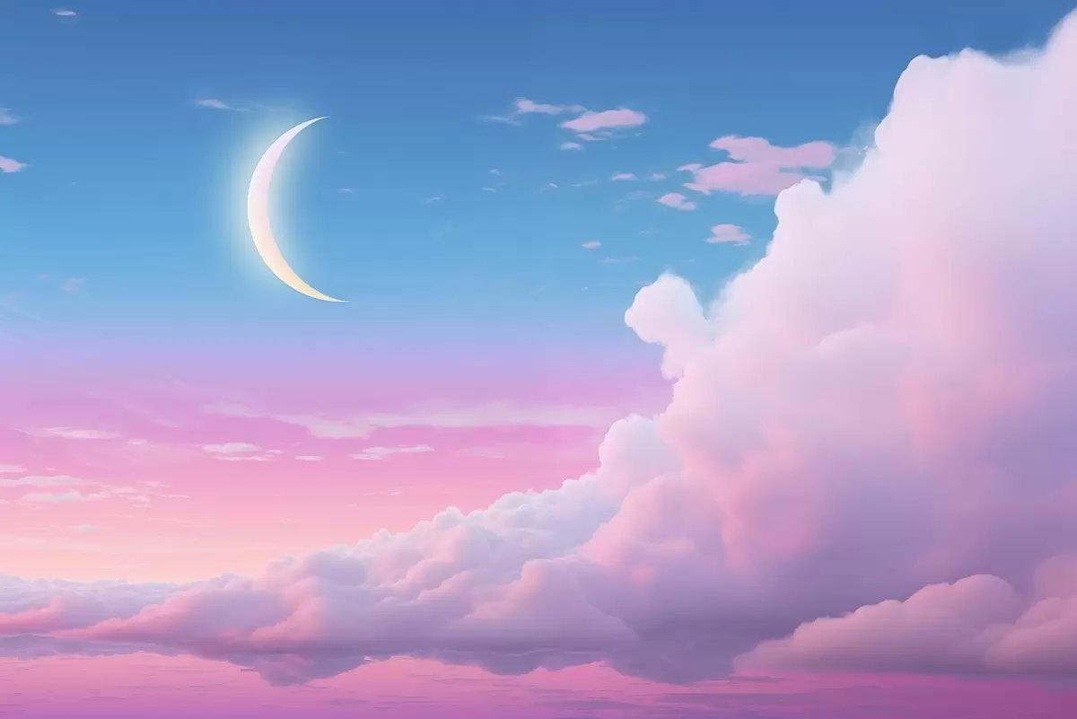 Peintures murales Coucher de soleil magique avec nuages et croissant de lune dans les tons roses et bleus Nr. w09240