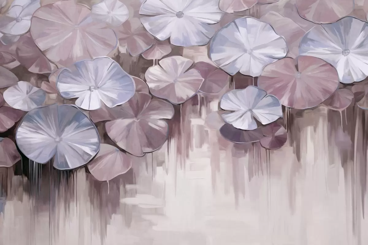 Peintures murales Nénuphars texturés aux couleurs violettes et bleues dans un étang, l'arrière-plan est un mélange flou de douces nuances de violet Nr. w09255v1