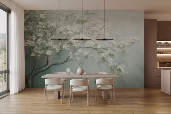 Peintures murales Un arbre en fleurs avec des fleurs blanches en pleine floraison, sur un fond texturé granuleux et bruyant de bleu et de vert atténués Nr. w09261