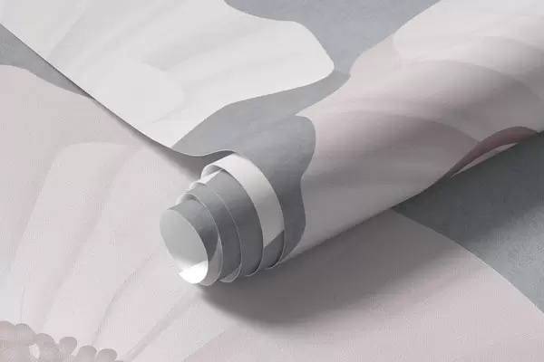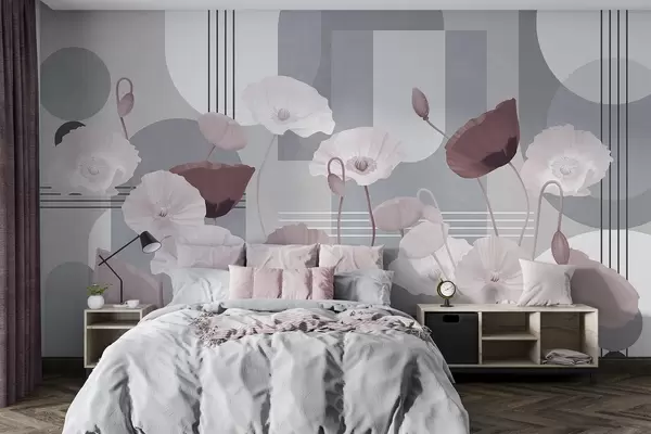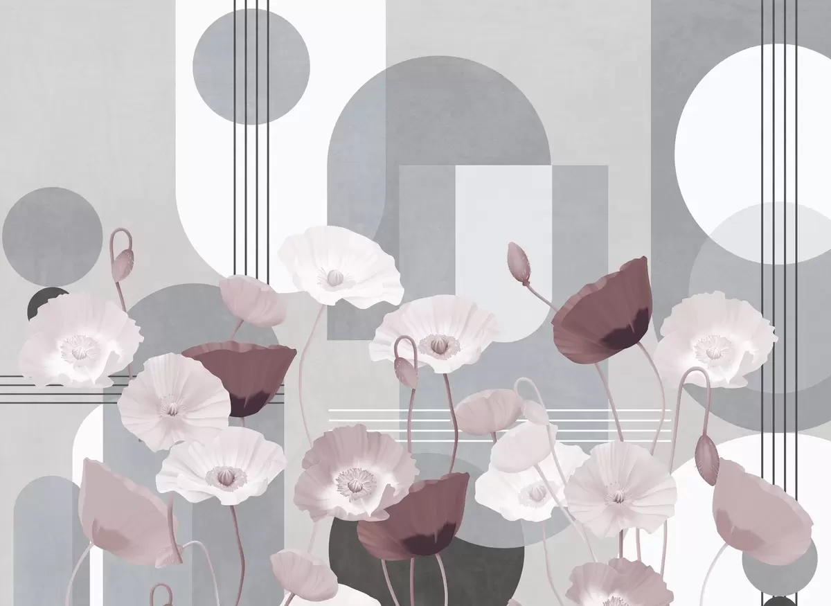 Peintures murales Coquelicots en blanc et gris avec des formes géométriques en arrière-plan, des cercles et des arcs, style minimaliste, couleurs douces Nr. w09289v1