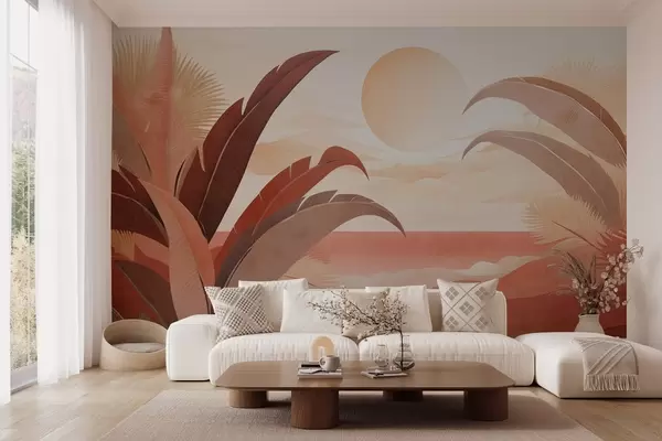 Peintures murales Paysage abstrait tropical texturé avec des feuilles de palmier et un grand soleil dans le ciel, palette de couleurs chaudes, style minimaliste, stylisé Nr. w09296