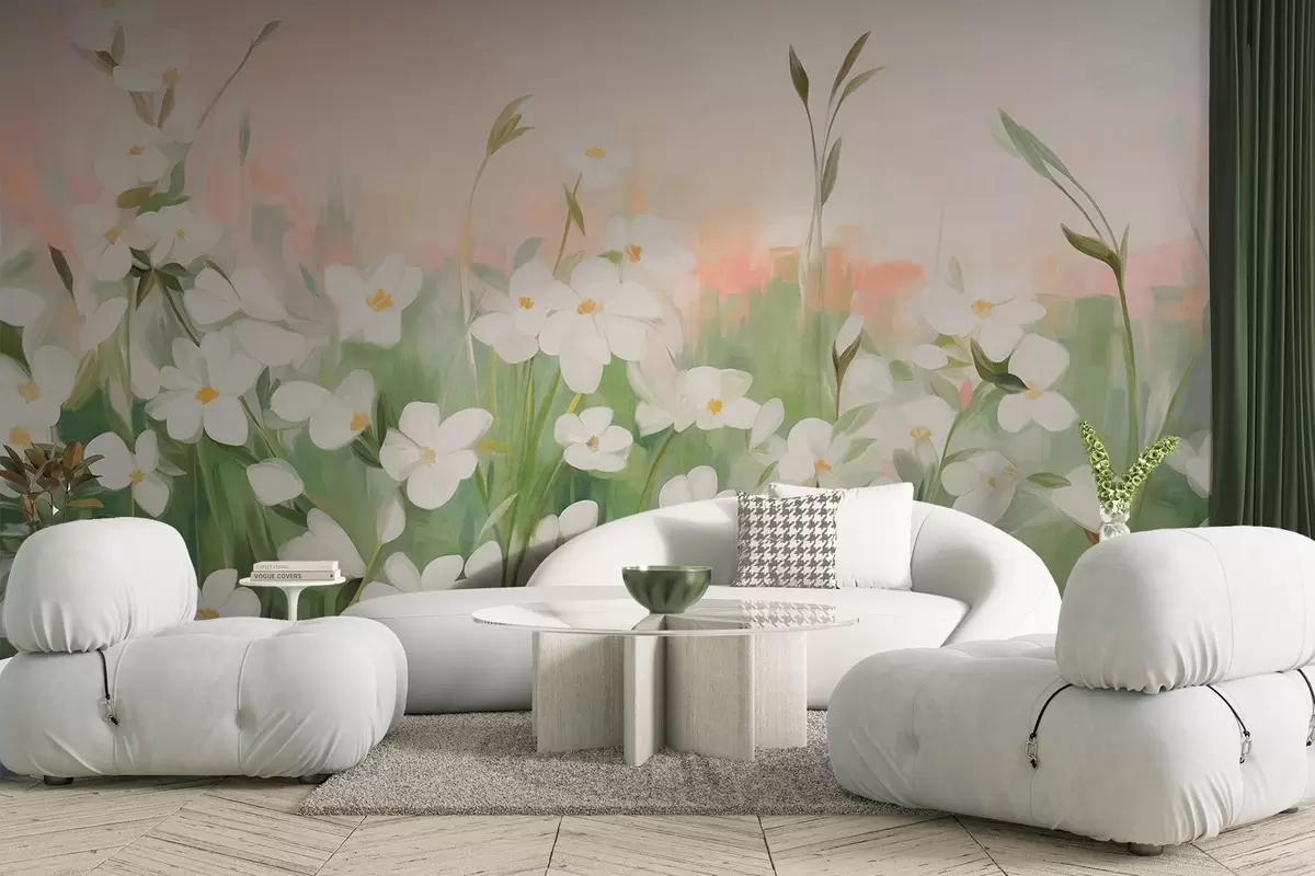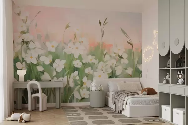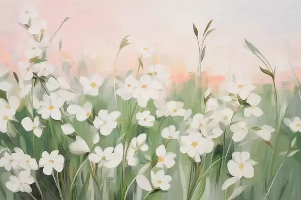 Peintures murales Champ abstrait de fleurs sauvages aux tiges et feuilles vertes, sur fond de ciel texturé rose pâle et blanc. Nr. w09297