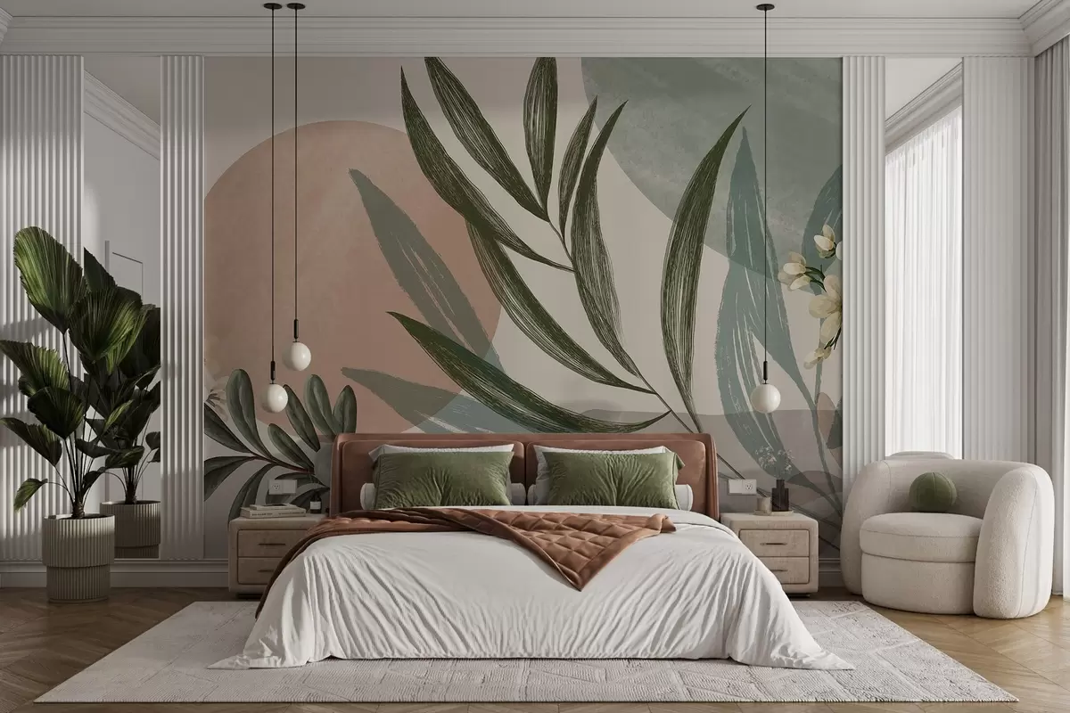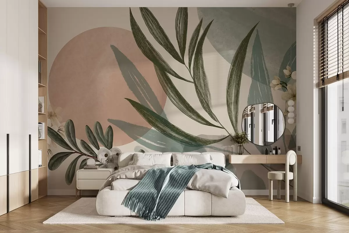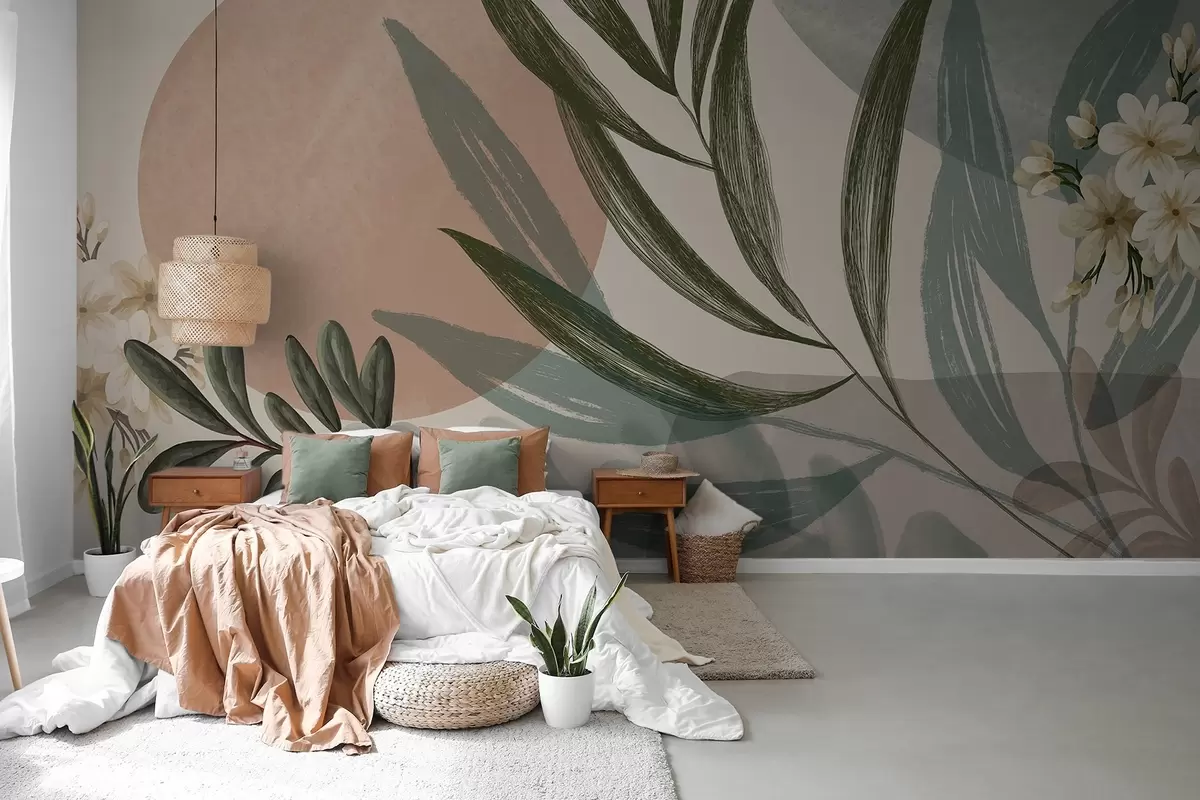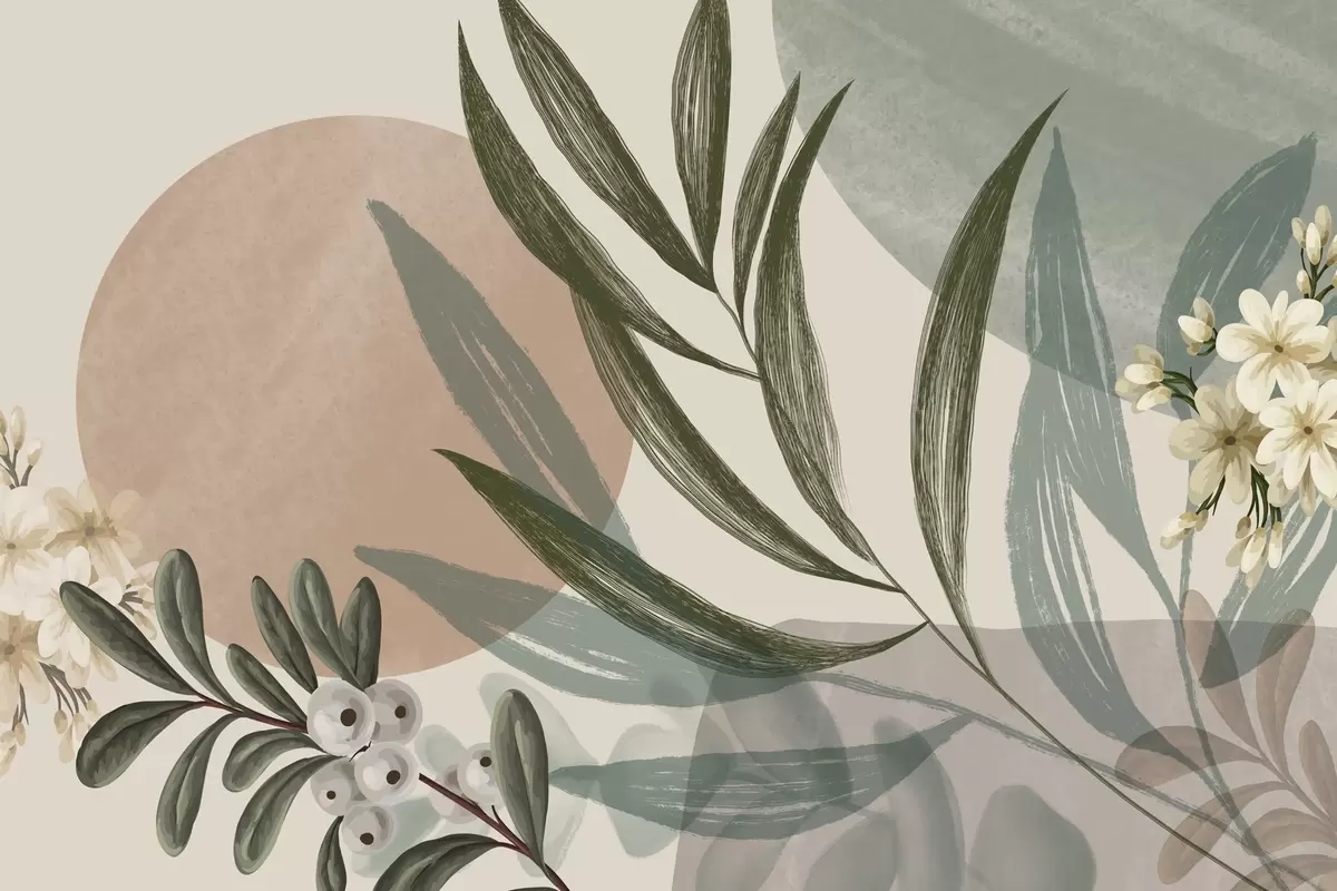 Peintures murales Art botanique abstrait avec des feuilles de palmier vertes et des baies blanches, sur un fond de formes dans des tons de terre sourds Nr. w09312