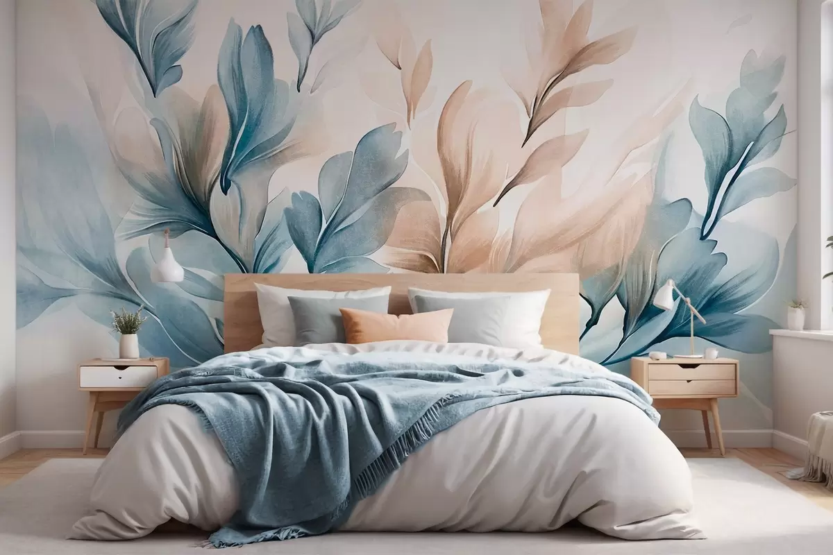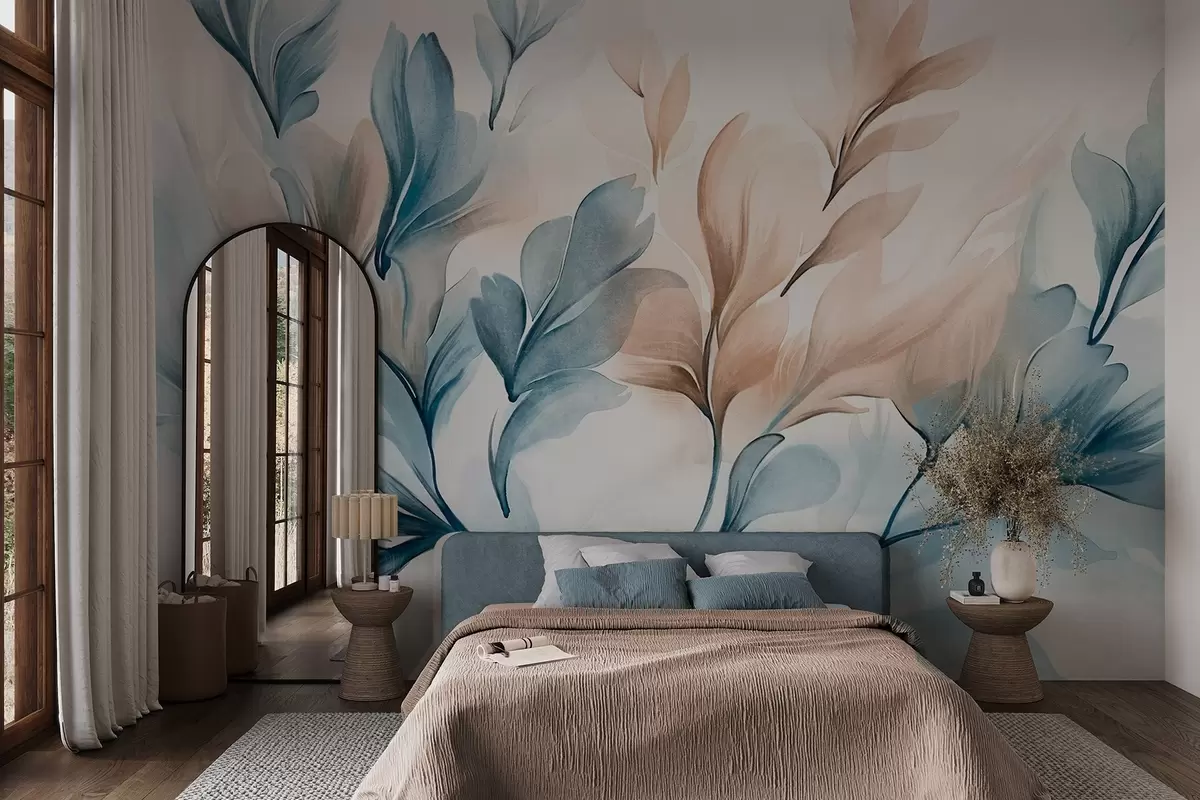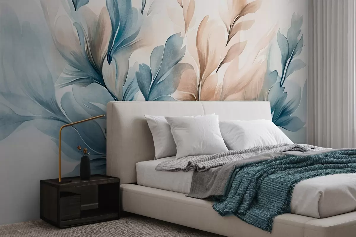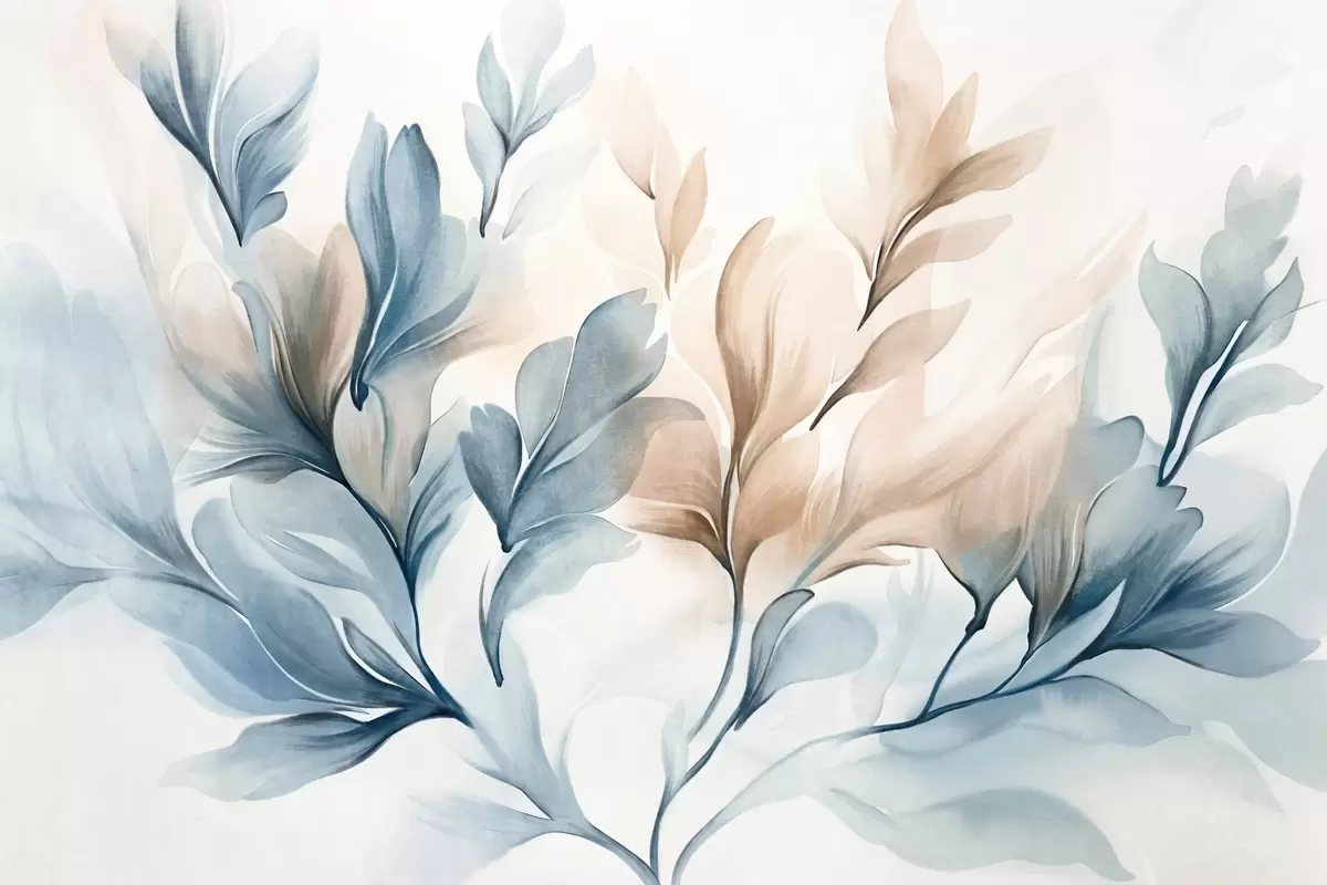 Peintures murales Feuilles abstraites bleues et brunes avec des coups de pinceau visibles, légères et texturées, palette de couleurs douces, effet aquarelle Nr. w09313