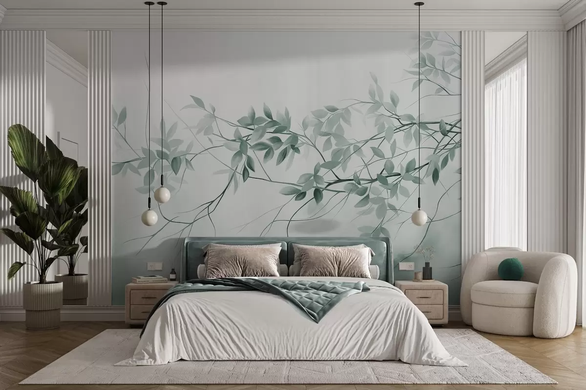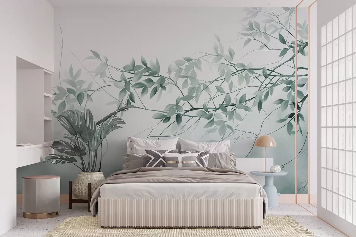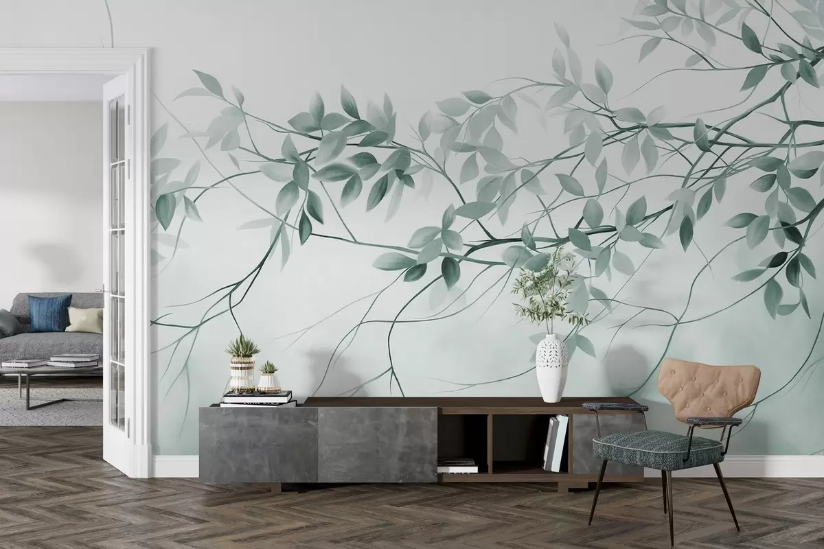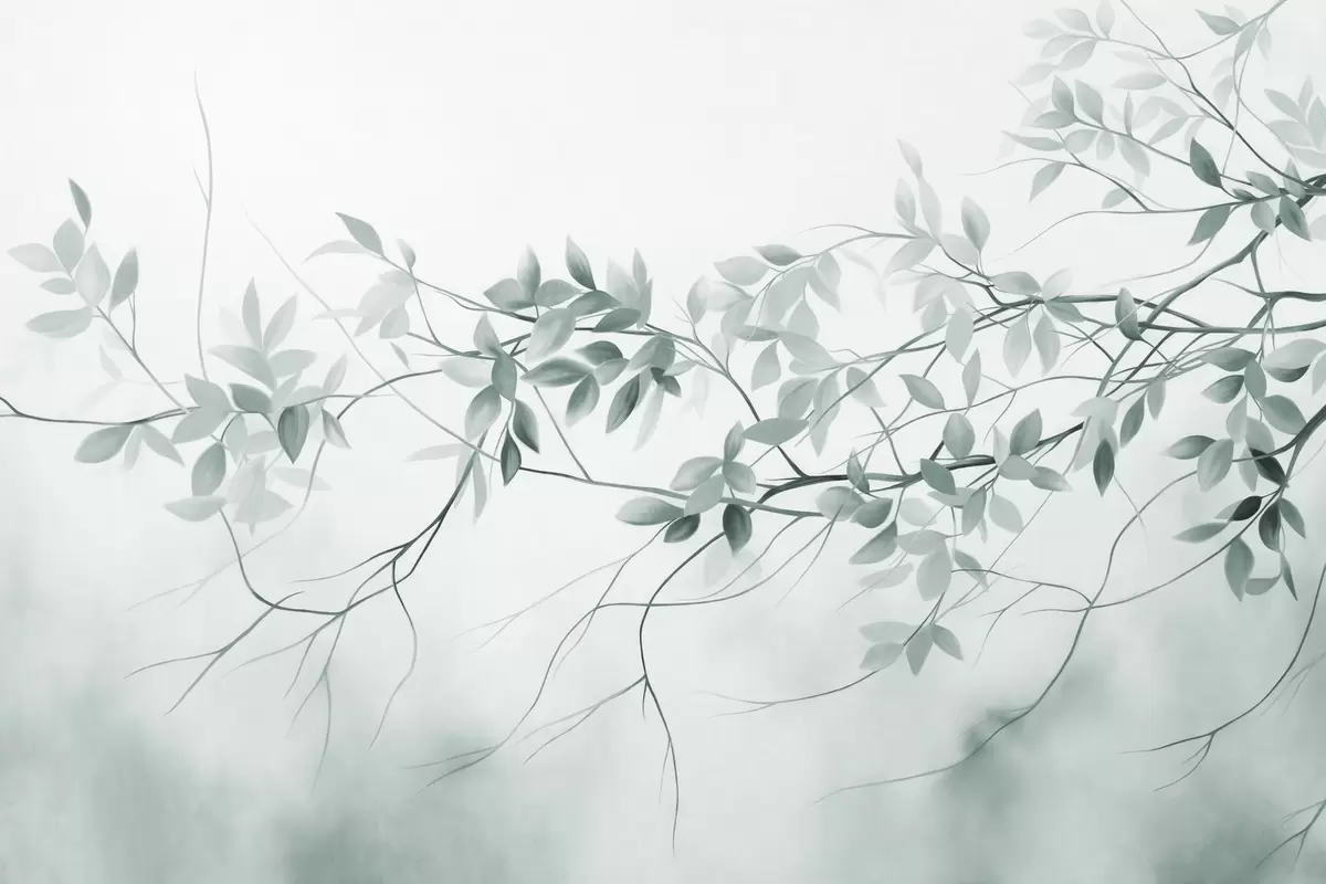 Peintures murales Branches délicatement texturées avec des feuilles grisâtres et vertes sur un fond doux et flou. Nr. w09336v1