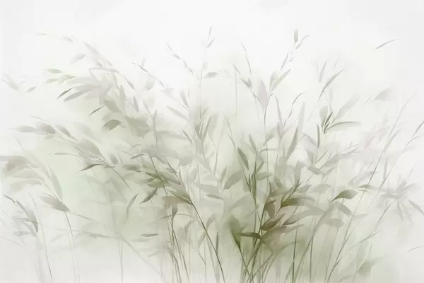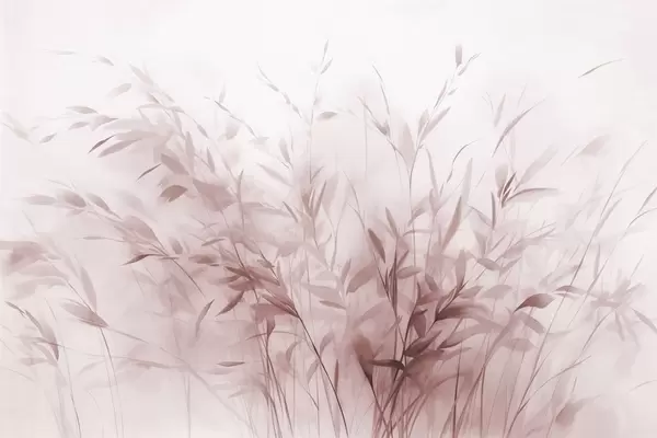 Peintures murales Herbe et mauvaises herbes avec des feuilles et des tiges fines, couleurs vertes et brunes, coups de pinceau doux et délicats, impression minimaliste Nr. w09342
