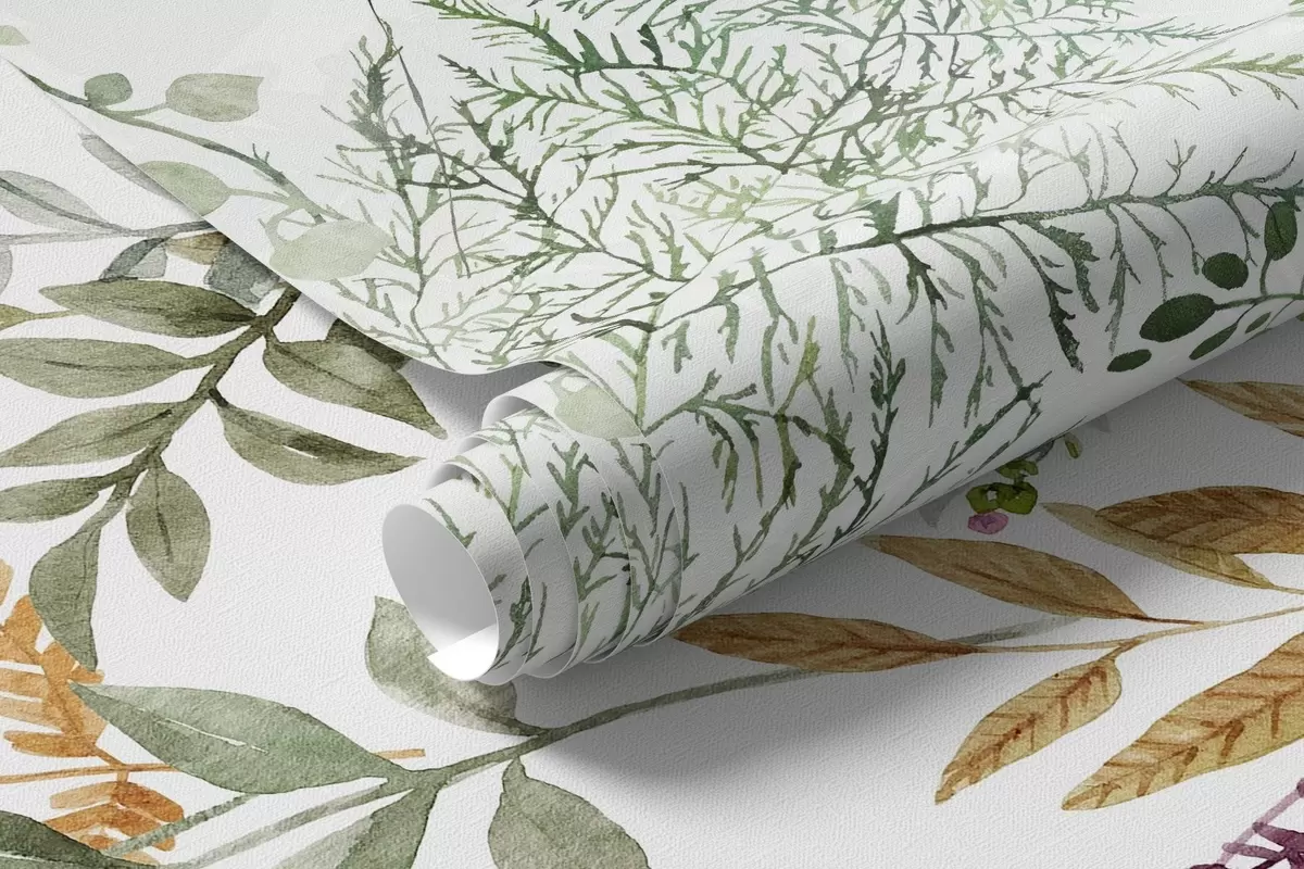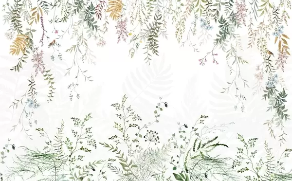 Peintures murales Illustration botanique avec des fougères, de l'herbe et des plantes suspendues, tons pastel, sur fond blanc style aquarelle texturée Nr. w09364