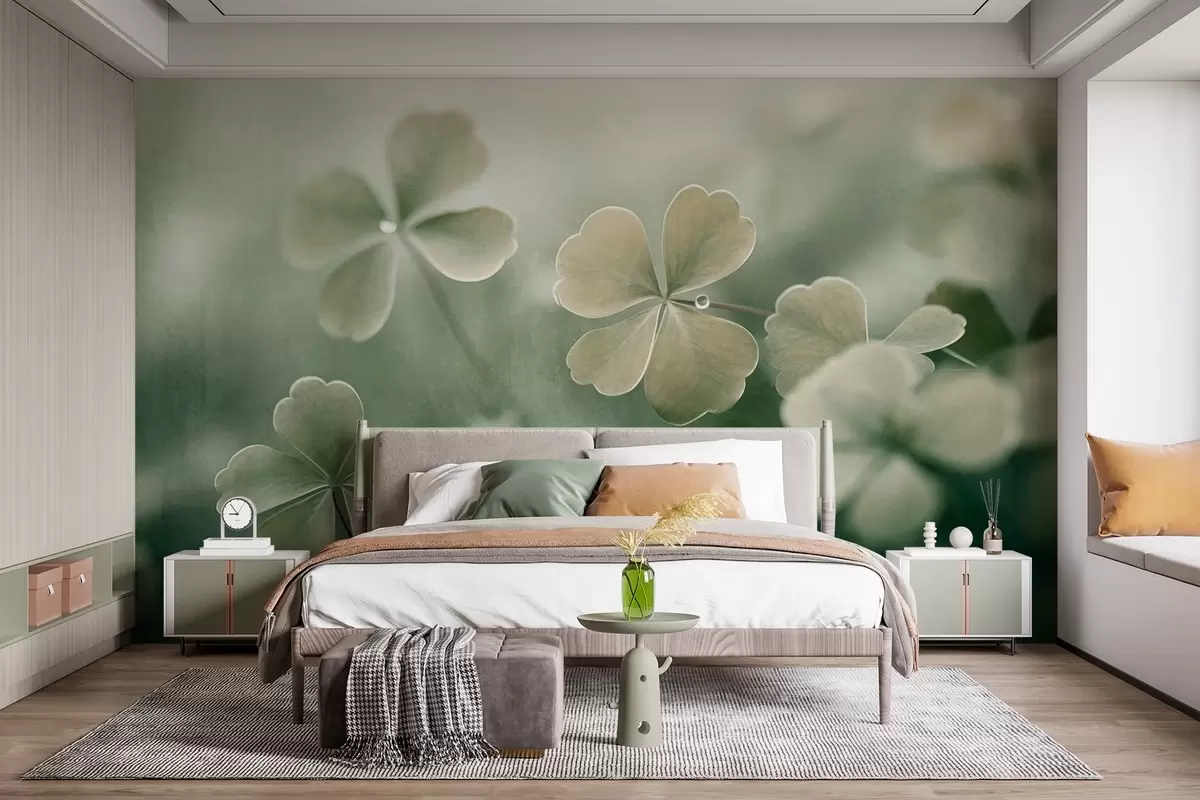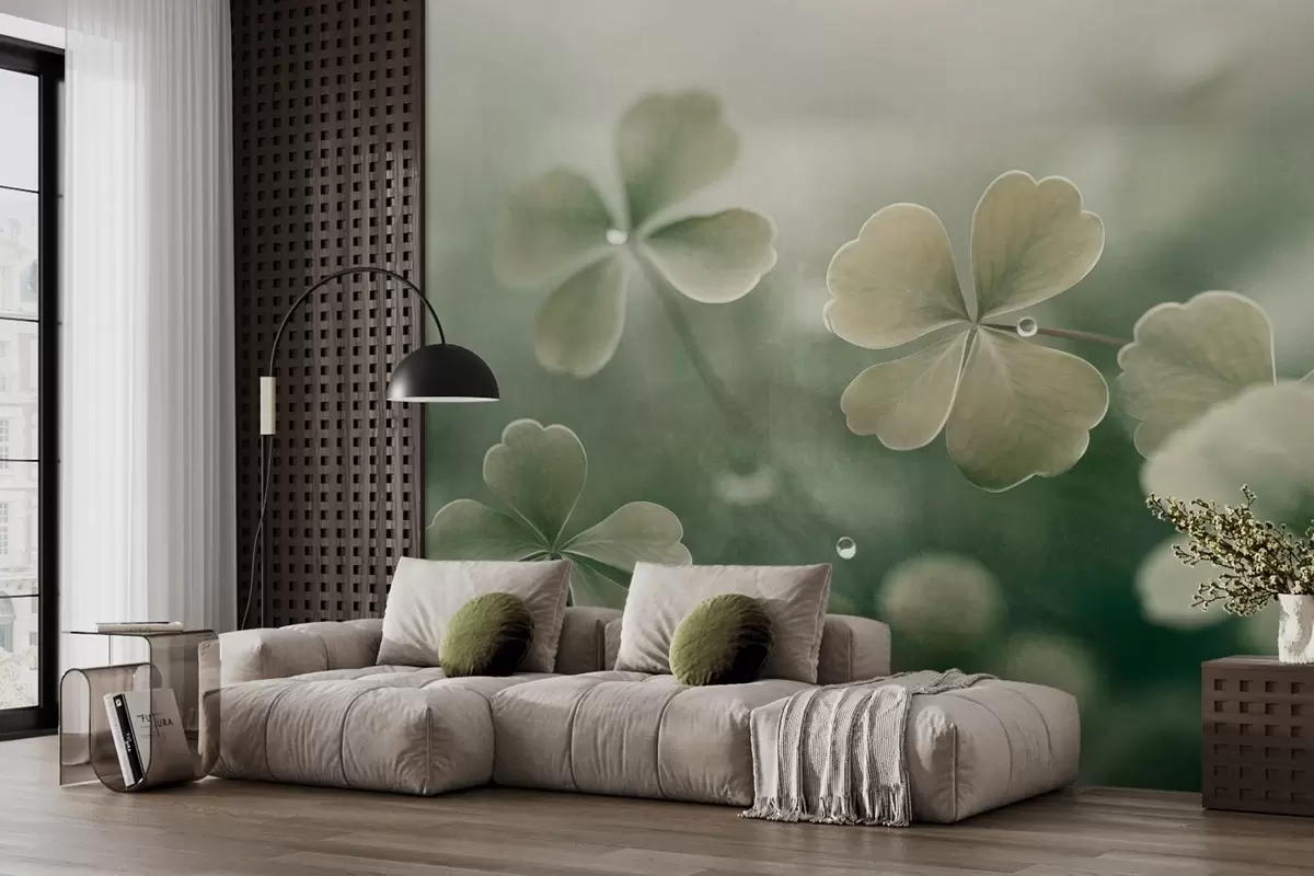 Peintures murales Trèfle à quatre feuilles avec gouttes d'eau, couleur vert clair, mise au point douce, arrière-plan flou, impression texturée Nr. w09376