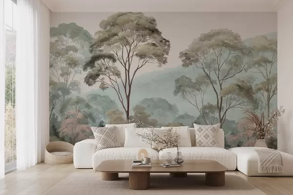 peintures murales Matin brumeux dans la forêt, style aquarelle w09405