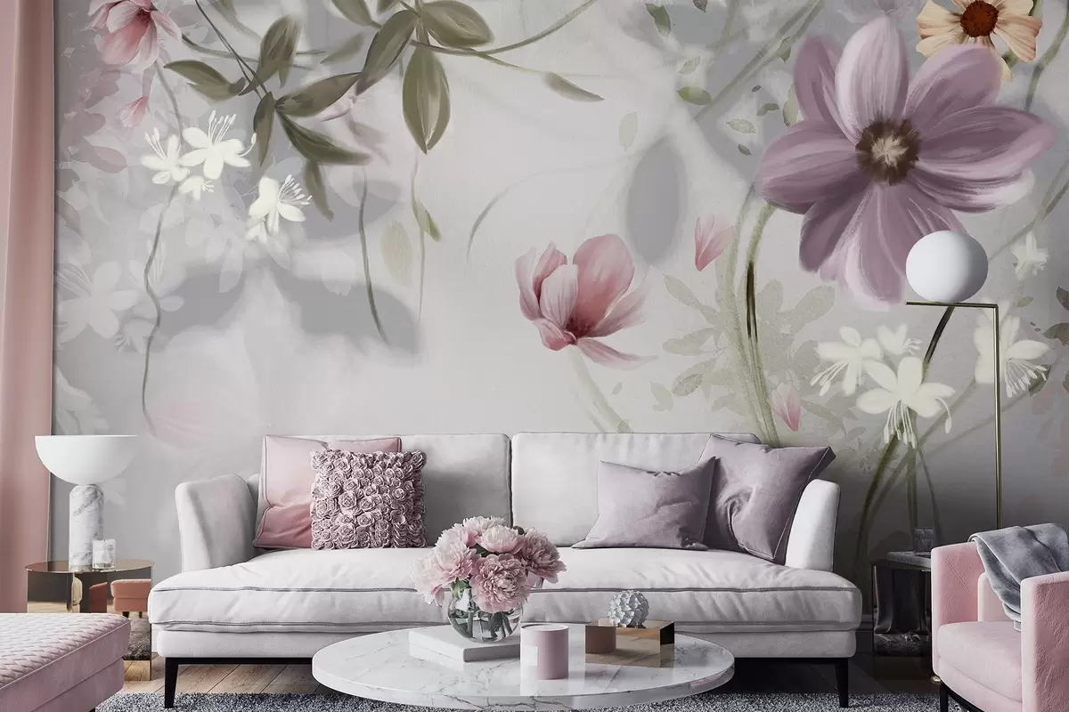 Peintures murales Fleurs roses et blanches avec tiges et feuilles vertes, éclairage tamisé, couleurs douces, composition florale Nr. w09417v1