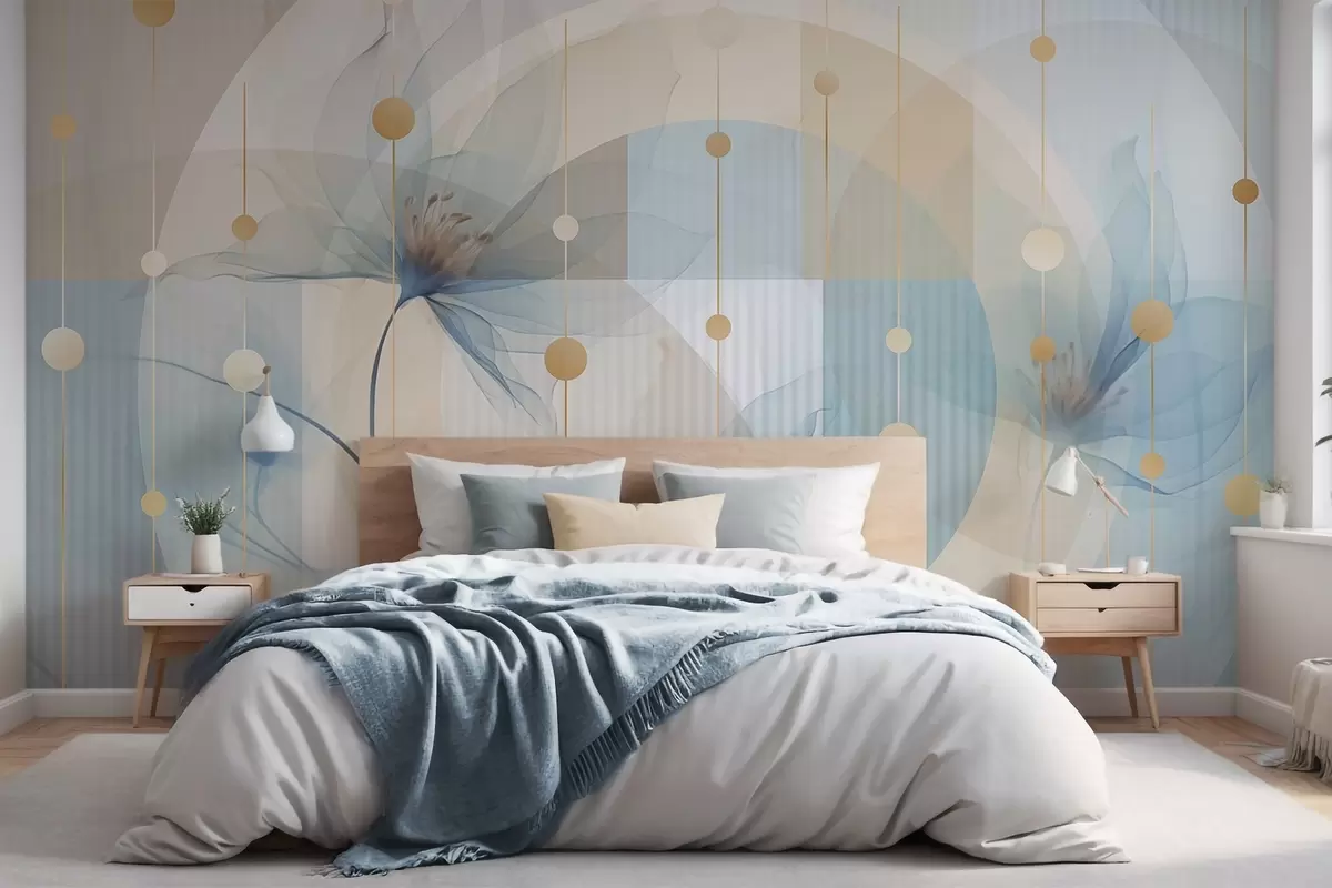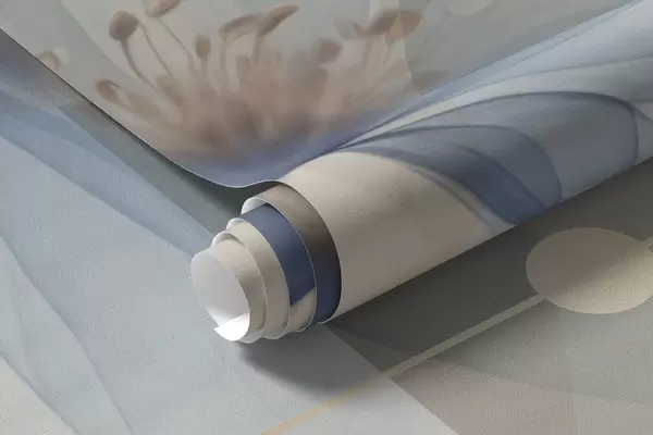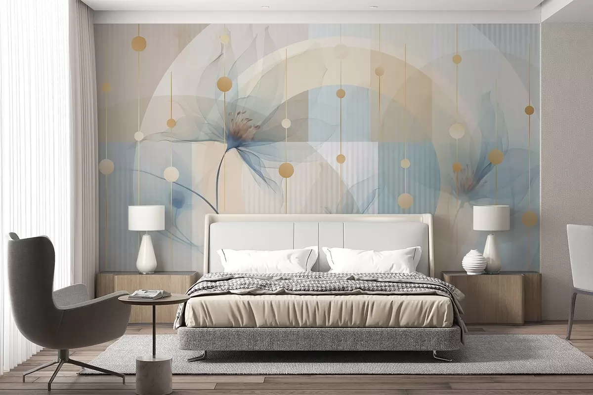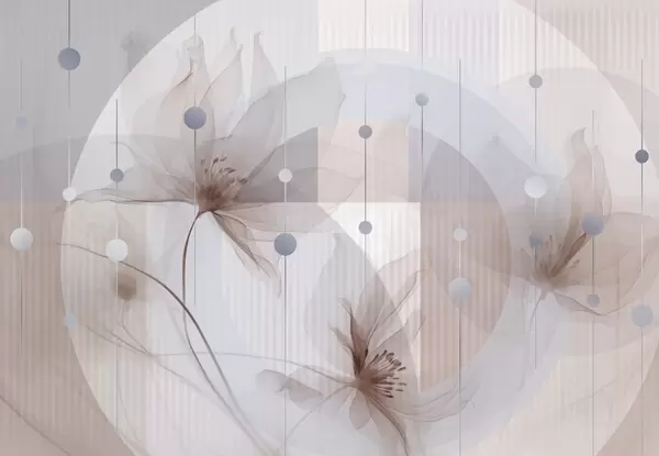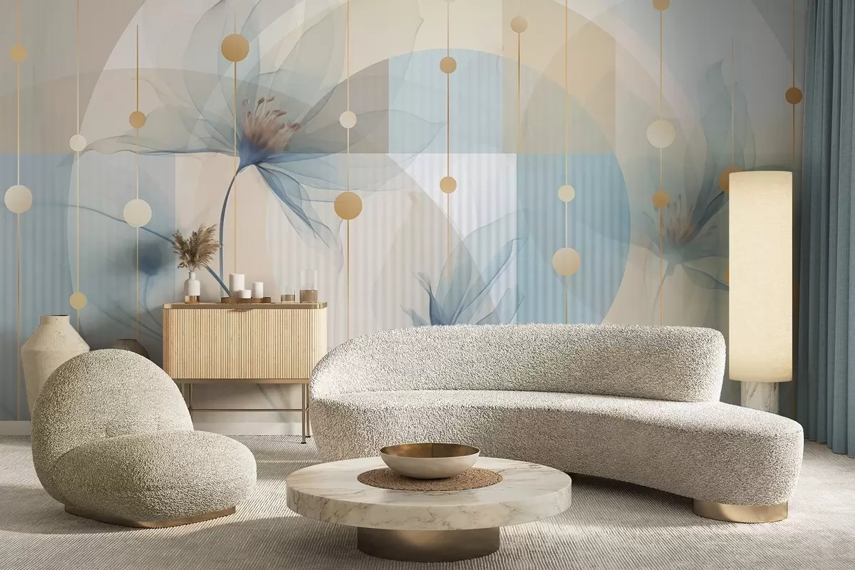 Peintures murales Fleurs abstraites translucides, cercles et formes géométriques, palette de couleurs bleu pastel, beige et blanc Nr. w09419