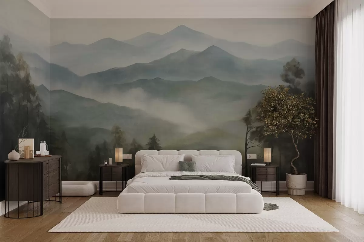 Peintures murales Chaîne de montagnes brumeuse avec des arbres, du brouillard, un ciel nuageux, des couleurs sourdes, style peinture paysagère Nr. w09424
