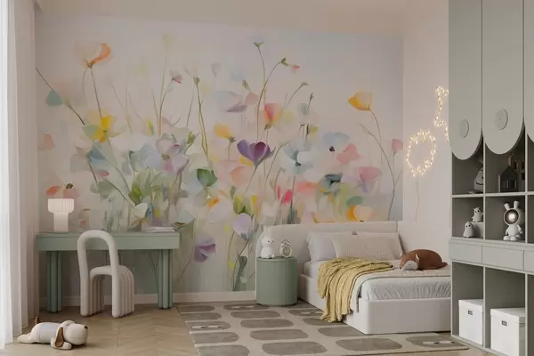 Peintures murales Champ abstrait de fleurs colorées à longues tiges et feuilles vertes, texturé, couleurs pastel et claires Nr. w09466