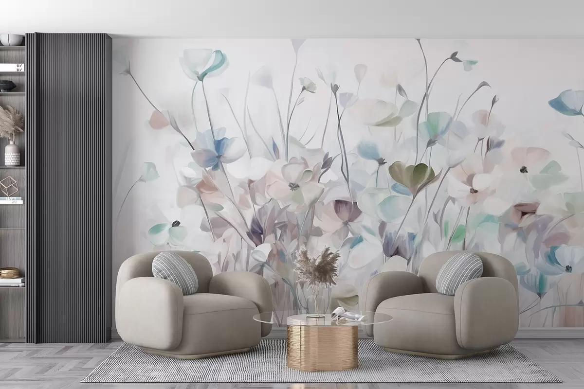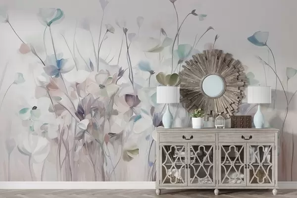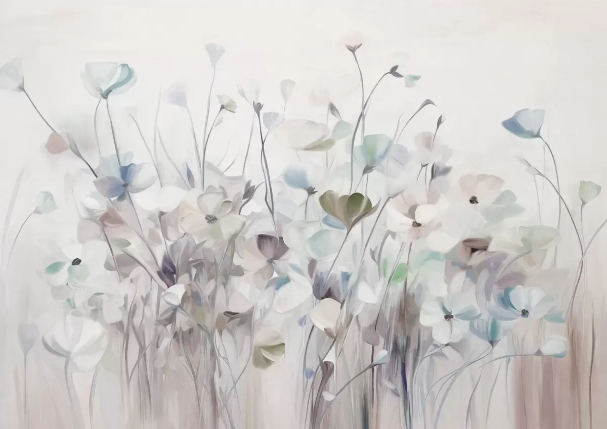 Peintures murales Champ abstrait de fleurs bleues et brunes avec de longues tiges et feuilles, texturé, couleurs pastel et douces Nr. w09466v1