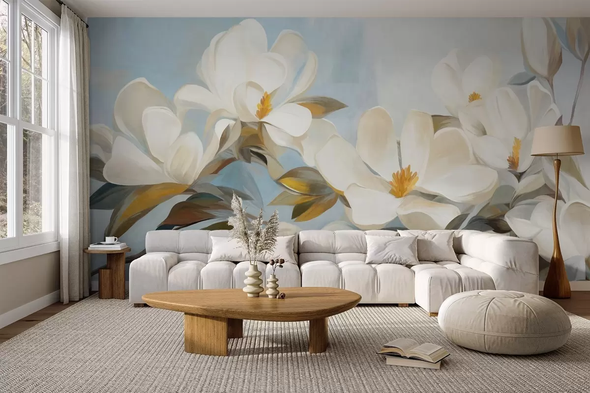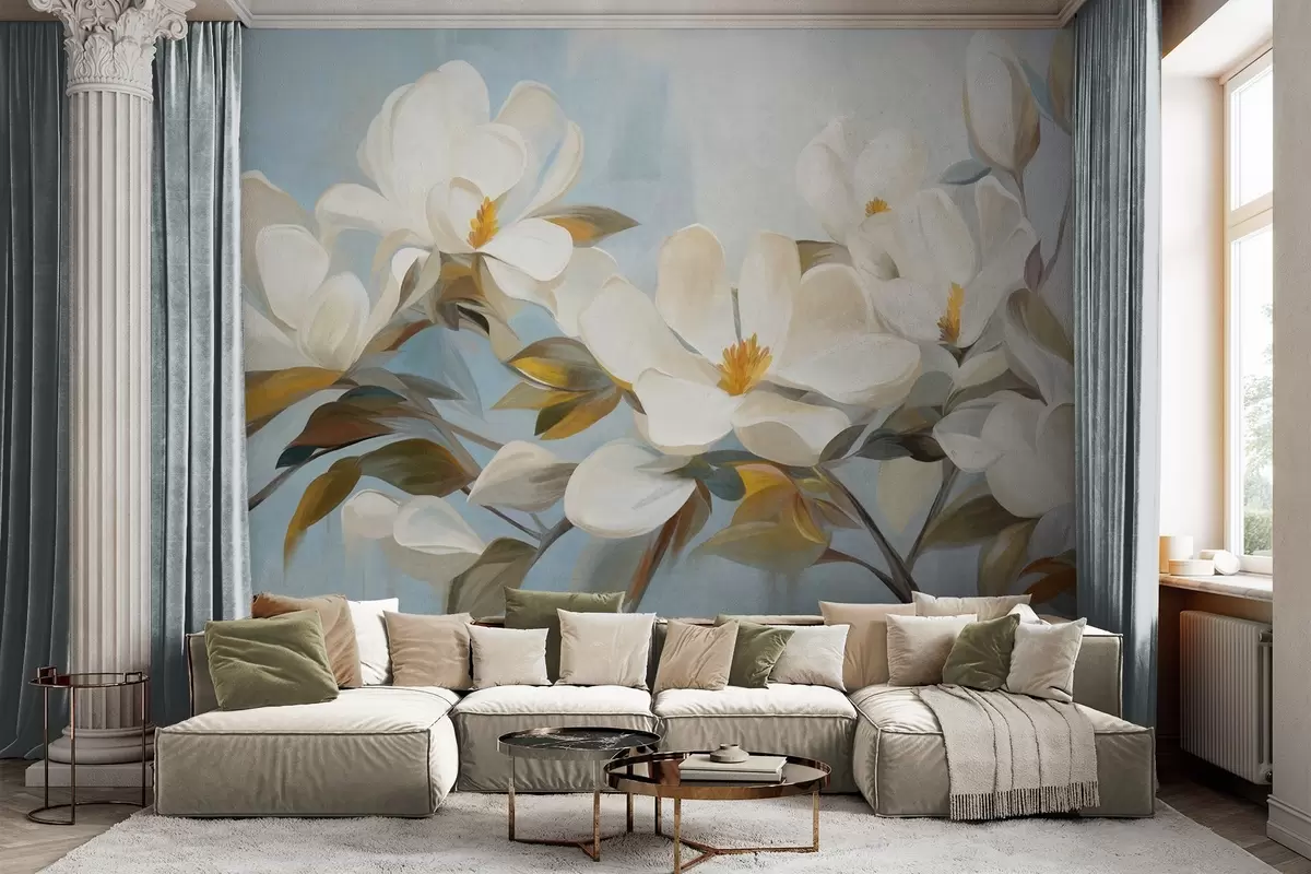 Peintures murales Magnolias blancs avec feuilles vertes sur fond bleu clair avec imitation de coups de pinceau abstraits Nr. w09478