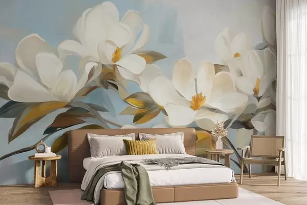 Peintures murales Magnolias blancs avec feuilles vertes sur fond bleu clair avec imitation de coups de pinceau abstraits Nr. w09478