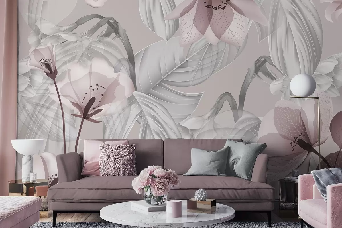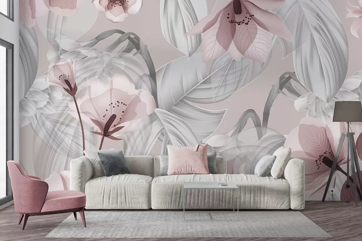 Peintures murales Fleurs roses et feuilles grises, fond botanique floral, design élégant, couleurs douces, détails légers et délicats Nr. w09497