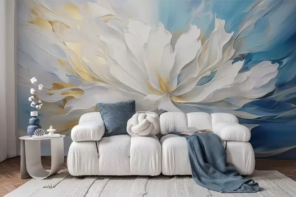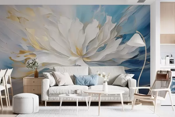 Peintures murales Grande pivoine blanche peinte à l'huile sur fond bleu-jaune Nr. w09511