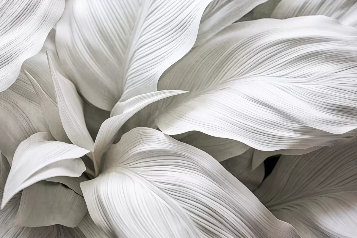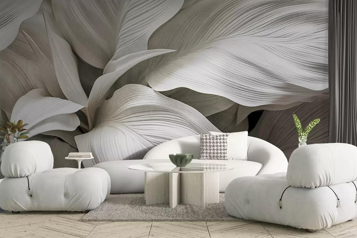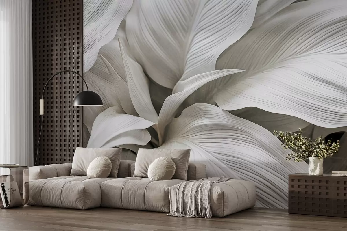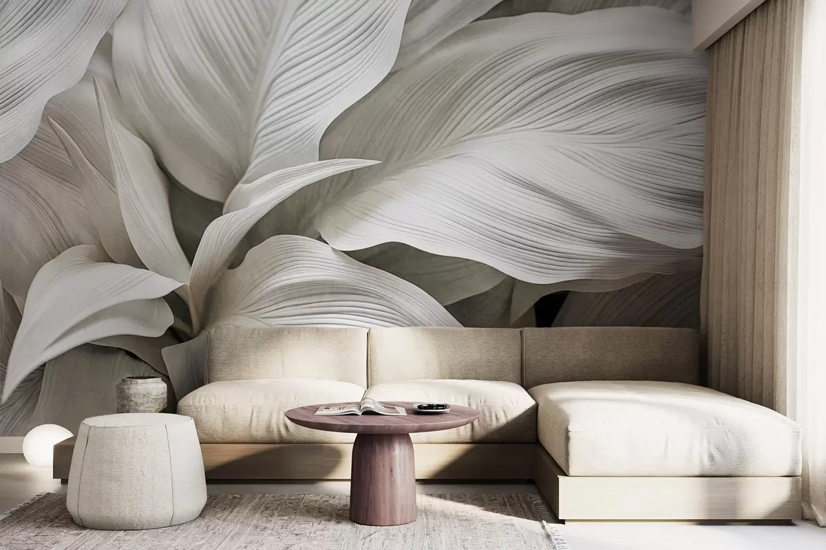 Peintures murales Grandes feuilles blanches texturées avec des nervures proéminentes, qui se chevauchent et créent de la profondeur. Nr. w09536