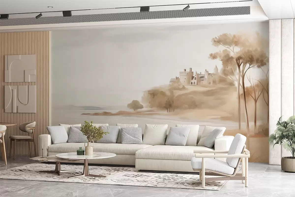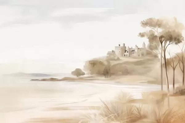 Peintures murales Paysage avec un château sur une colline près de la mer, une plage de sable au premier plan, couleurs douces, art texturé Nr. w09540