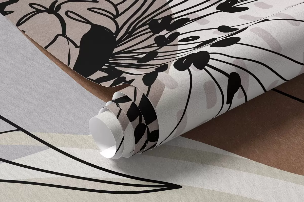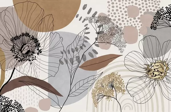 Peintures murales Imprimé abstrait à motifs floraux texturés avec des fleurs, des feuilles et des formes organiques dessinées au trait dans des tons bruns, beiges et gris discrets. Nr. w09548