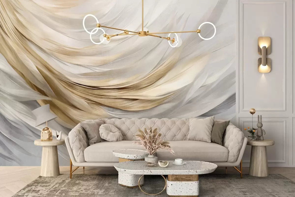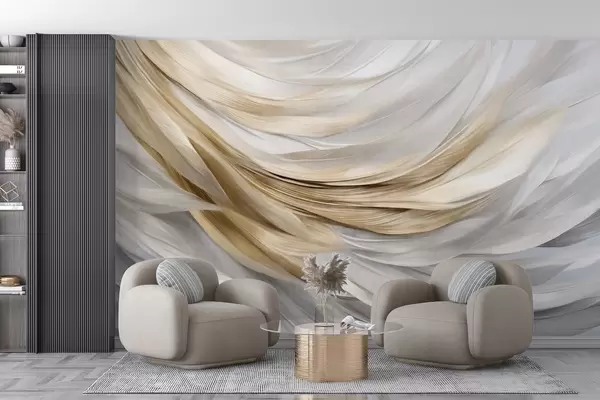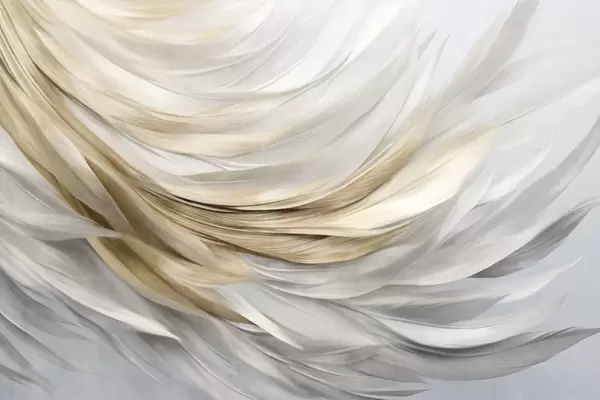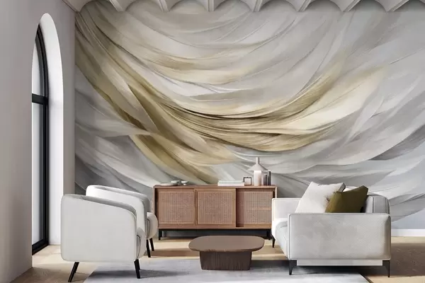 Peintures murales Plumes abstraites texturées blanches, grises et jaunes, créant un motif fluide et superposé sur un fond clair. Nr. w09557