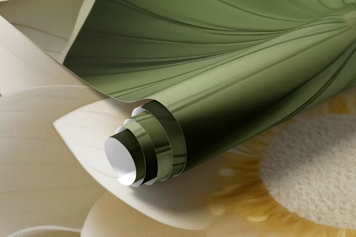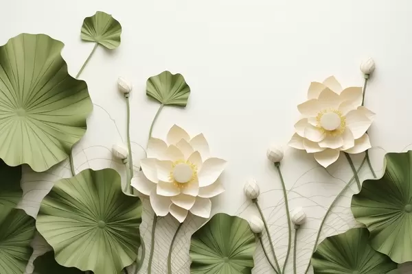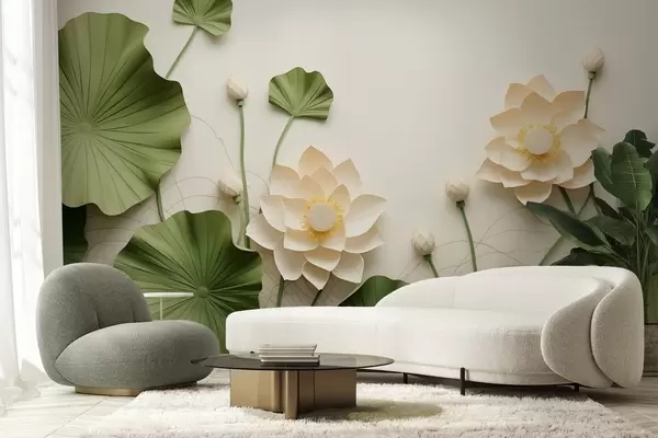 Peintures murales Fleurs de lotus en 3D avec feuilles vertes texturées, style minimaliste Nr. w09560