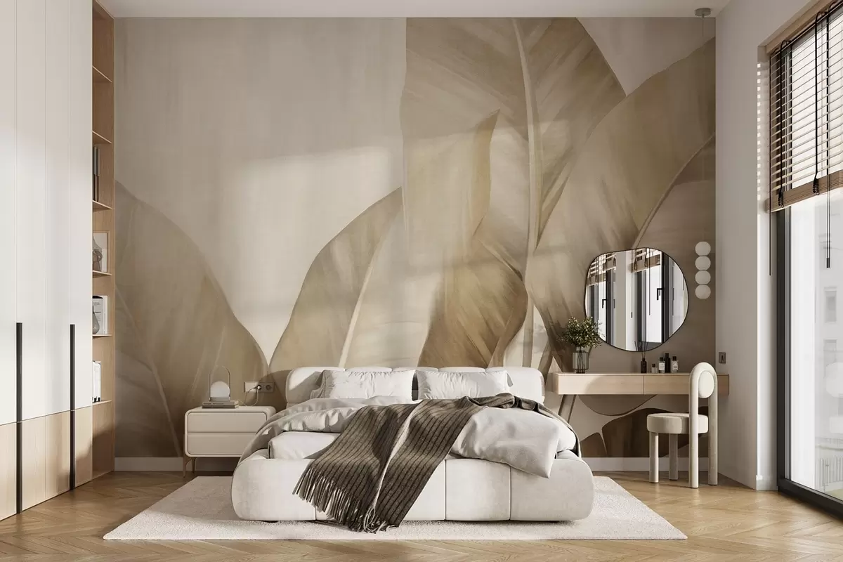 Peintures murales Grandes feuilles de bananier texturées, de couleur brun clair, sur fond beige clair, avec une esthétique douce et minimaliste. Nr. w09586