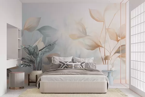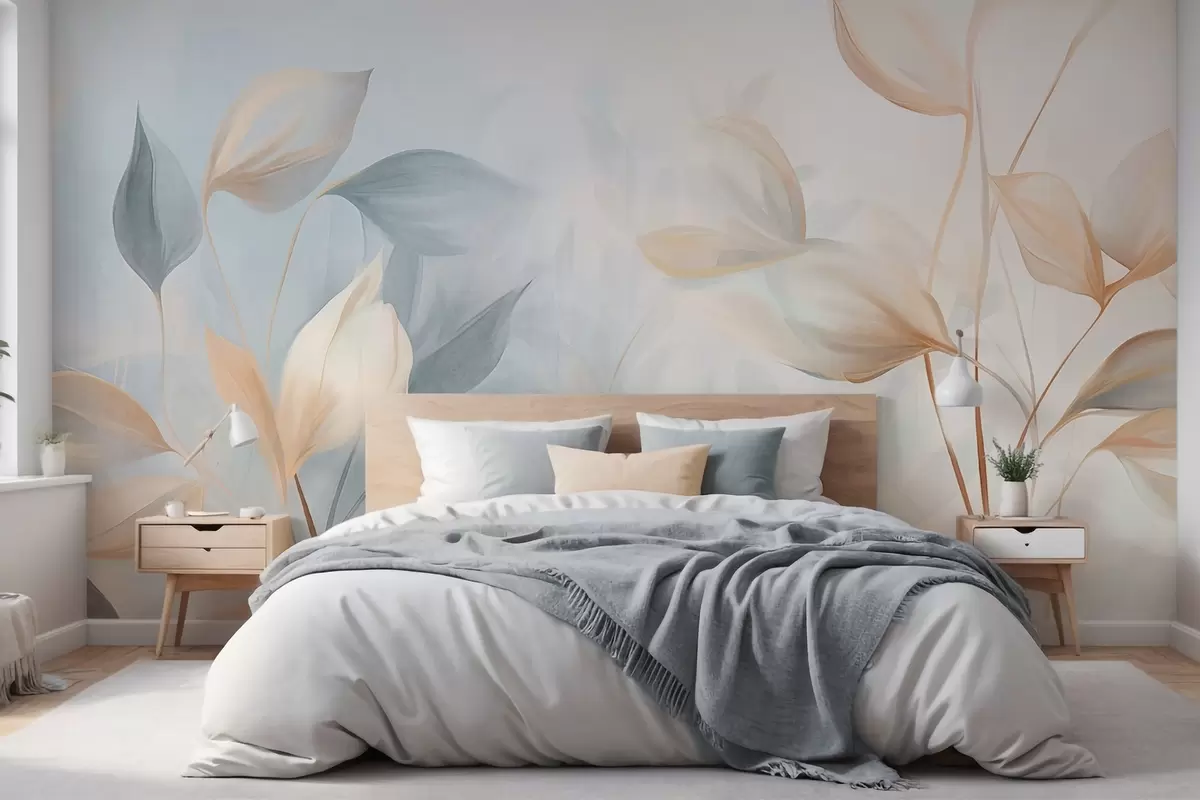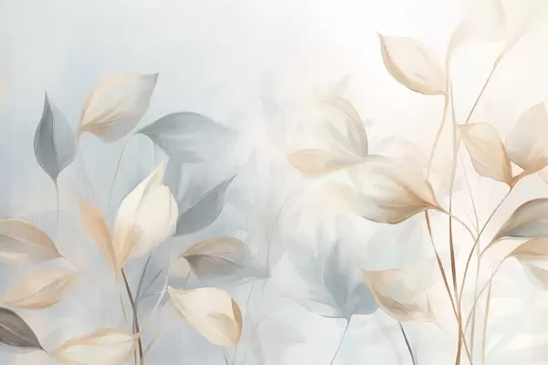 Peintures murales Feuilles douces, délicates et translucides dans des tons discrets de beige, pêche et bleu pâle, art pastel texturé. Nr. w09607