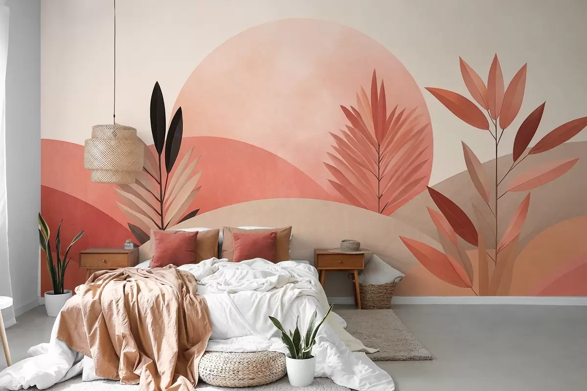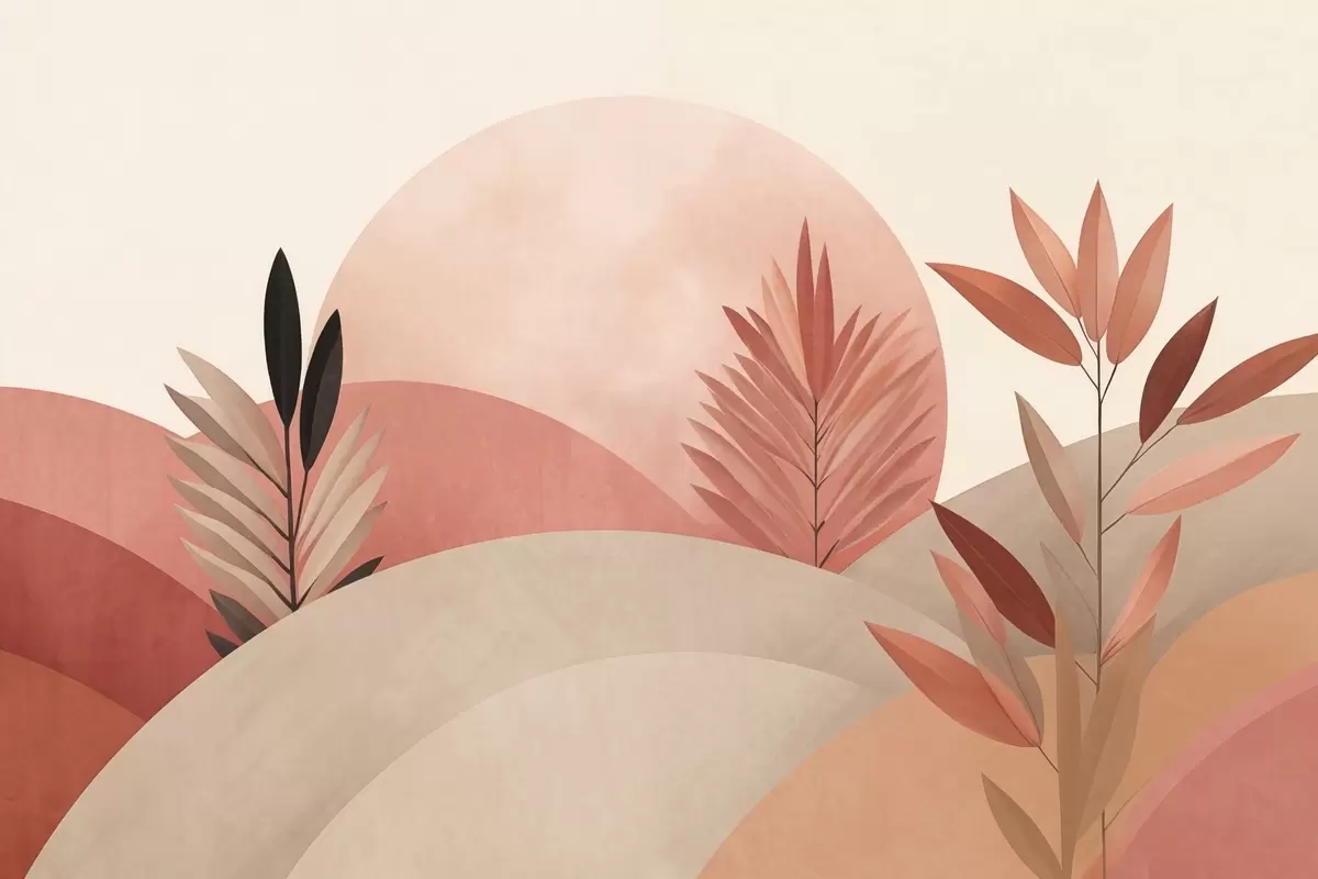 Peintures murales Paysage bohème abstrait, soleil derrière des collines vallonnées, plantes au premier plan, minimaliste, texturé, couleurs douces Nr. w09608
