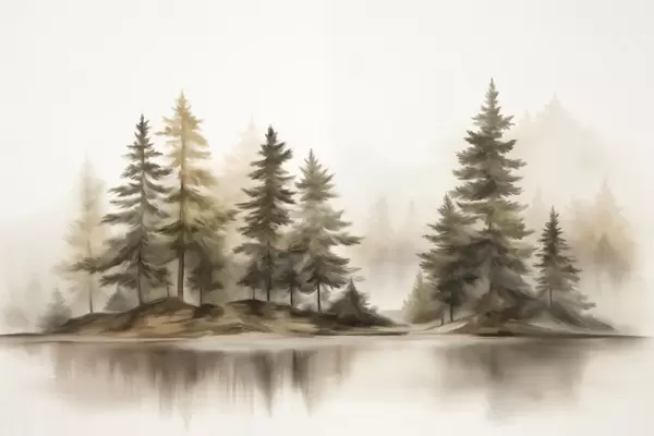 Peintures murales Une forêt brumeuse texturée avec de grands pins peints en imitation Nr. w09610