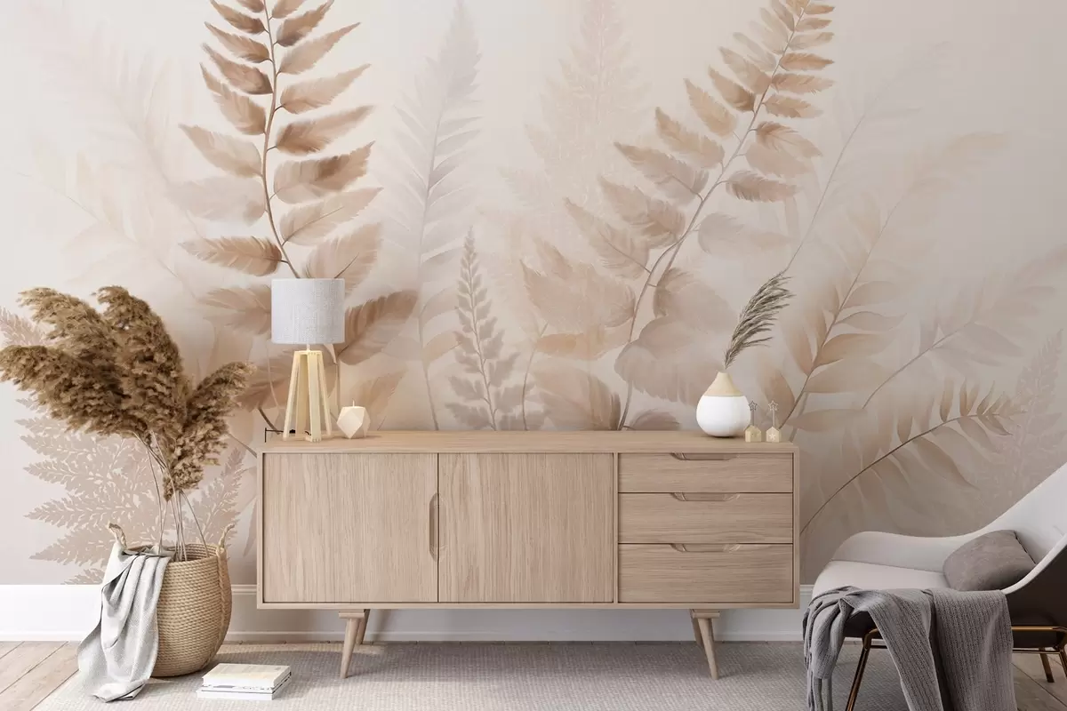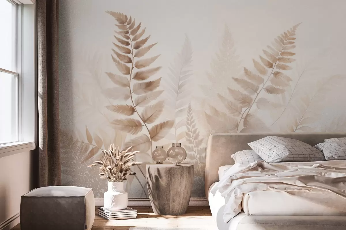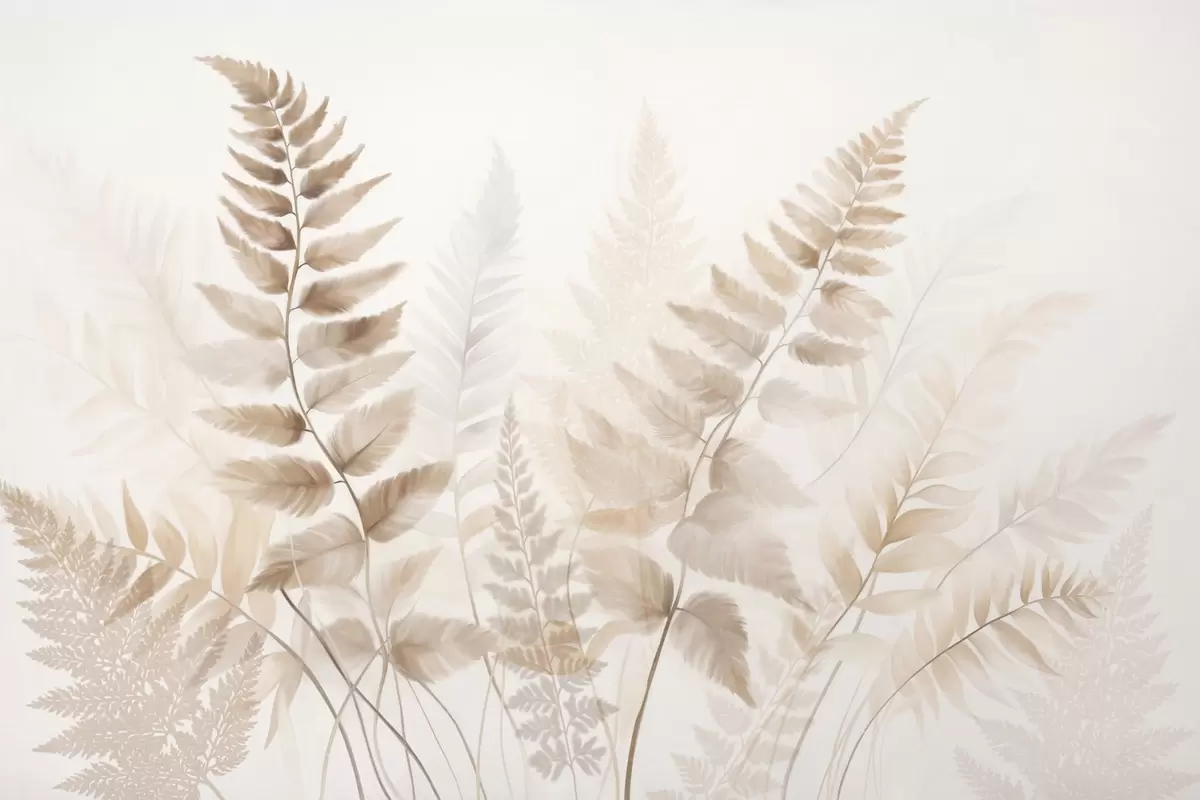Peintures murales Fronde de fougère séchée texturée dans différentes nuances de brun, avec un fond doux et clair dans un style aquarelle. Nr. w09615