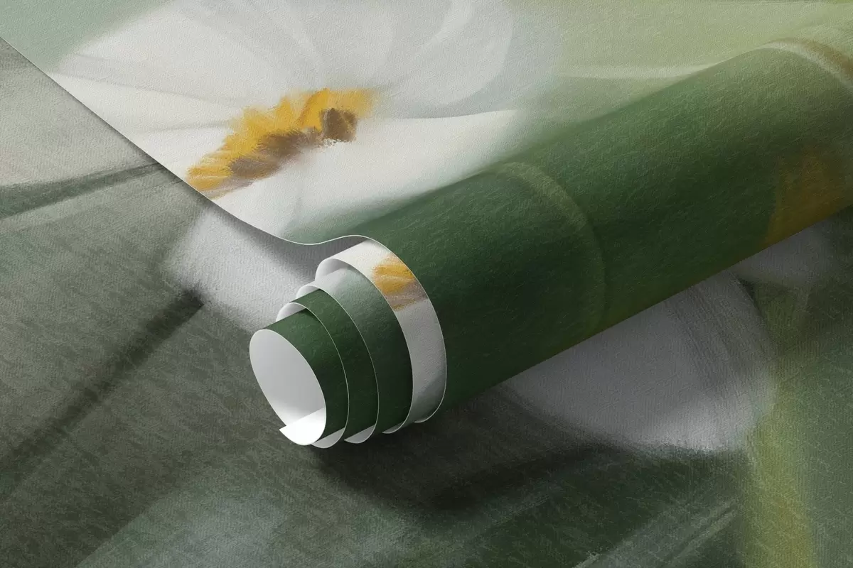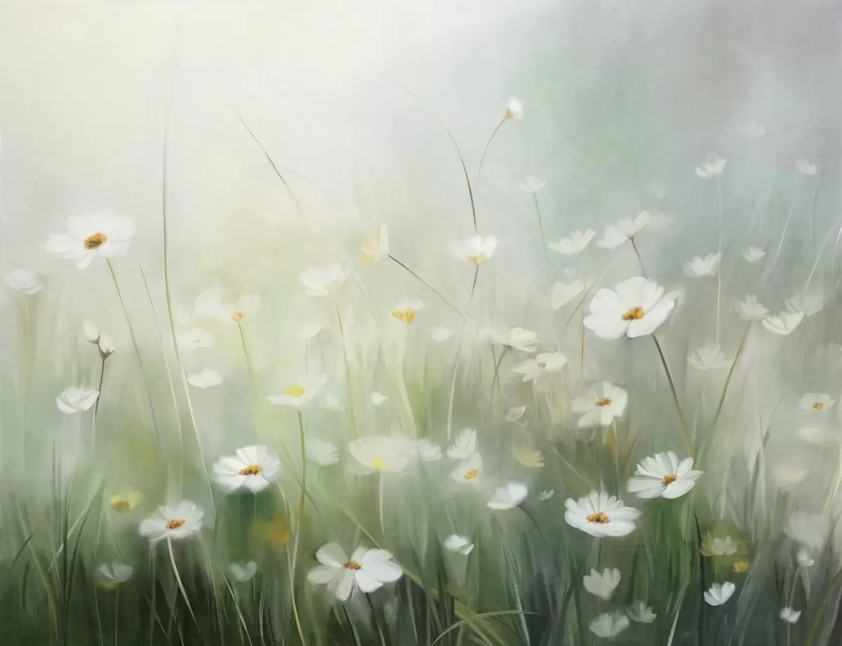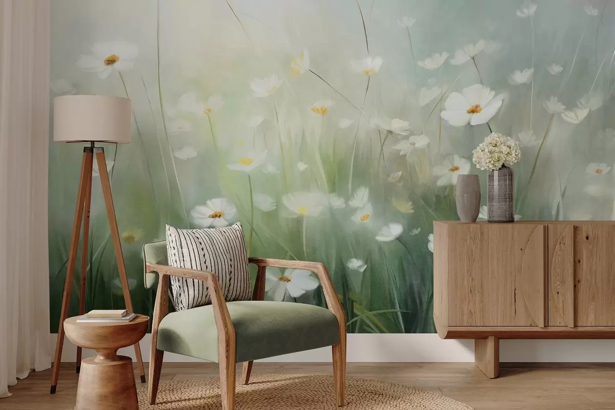 Peintures murales Champ abstrait de marguerites blanches avec de l'herbe verte et un arrière-plan doux et brumeux dans un style pictural Nr. w09619