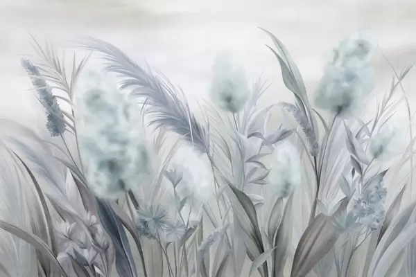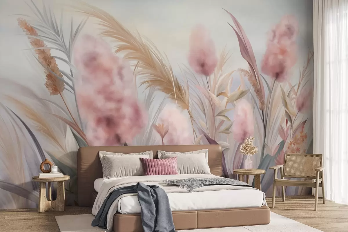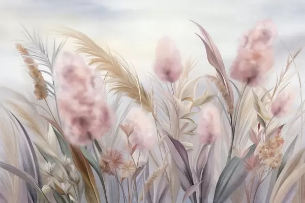 Peintures murales Herbe de la pampa rose et beige et autres fleurs séchées avec un ciel doux et brumeux en arrière-plan Nr. w09635