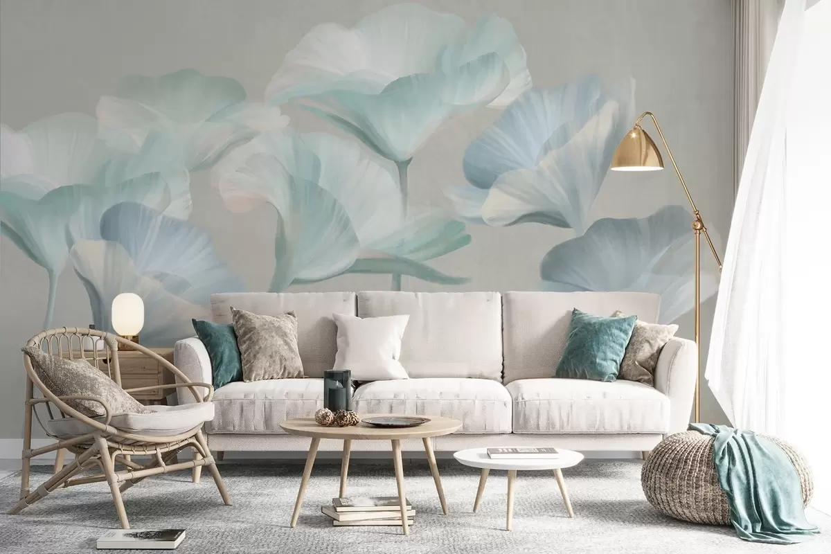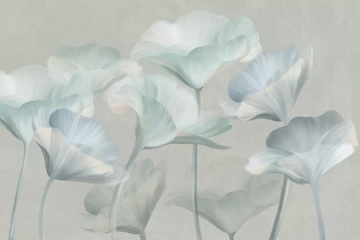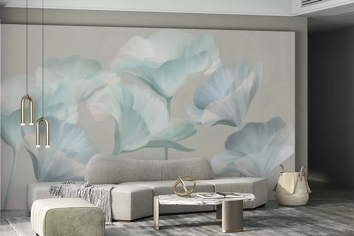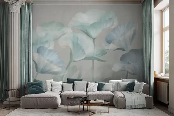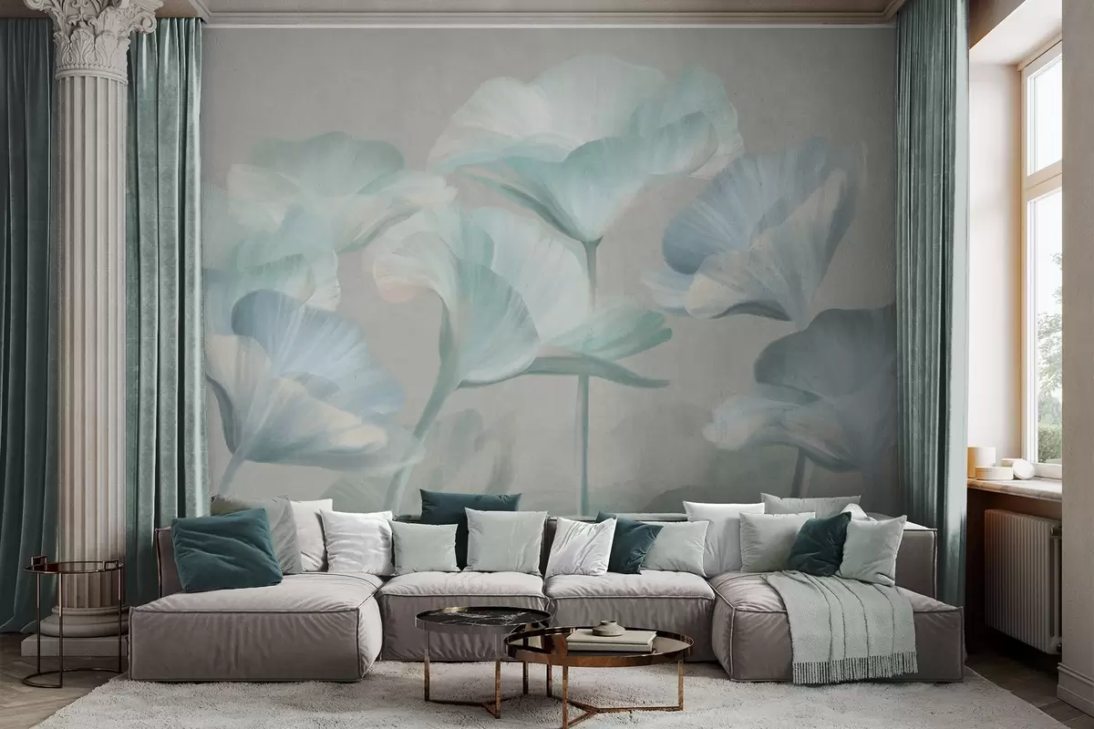 Peintures murales Fleurs de lotus translucides texturées, de couleur turquoise pâle, aux pétales délicats, sur fond gris discret. Nr. w09640v2