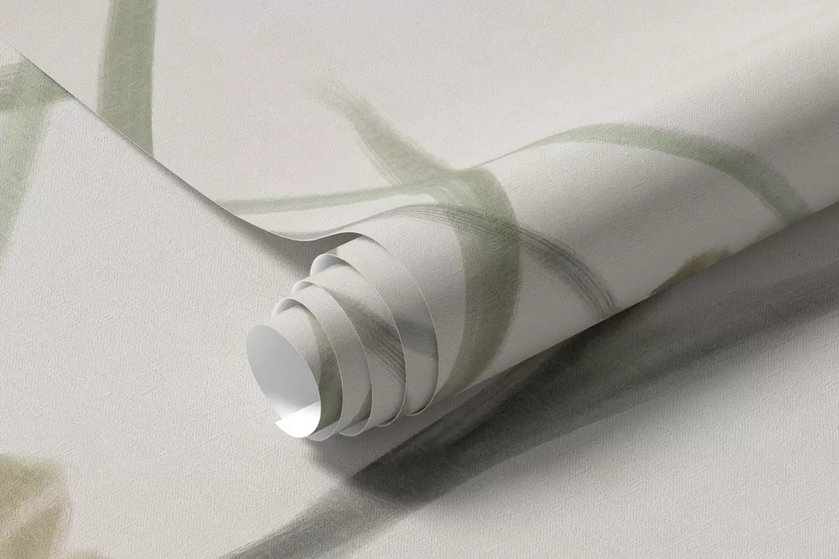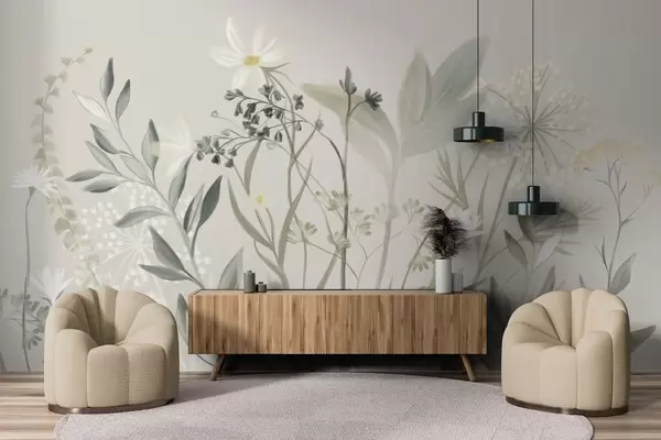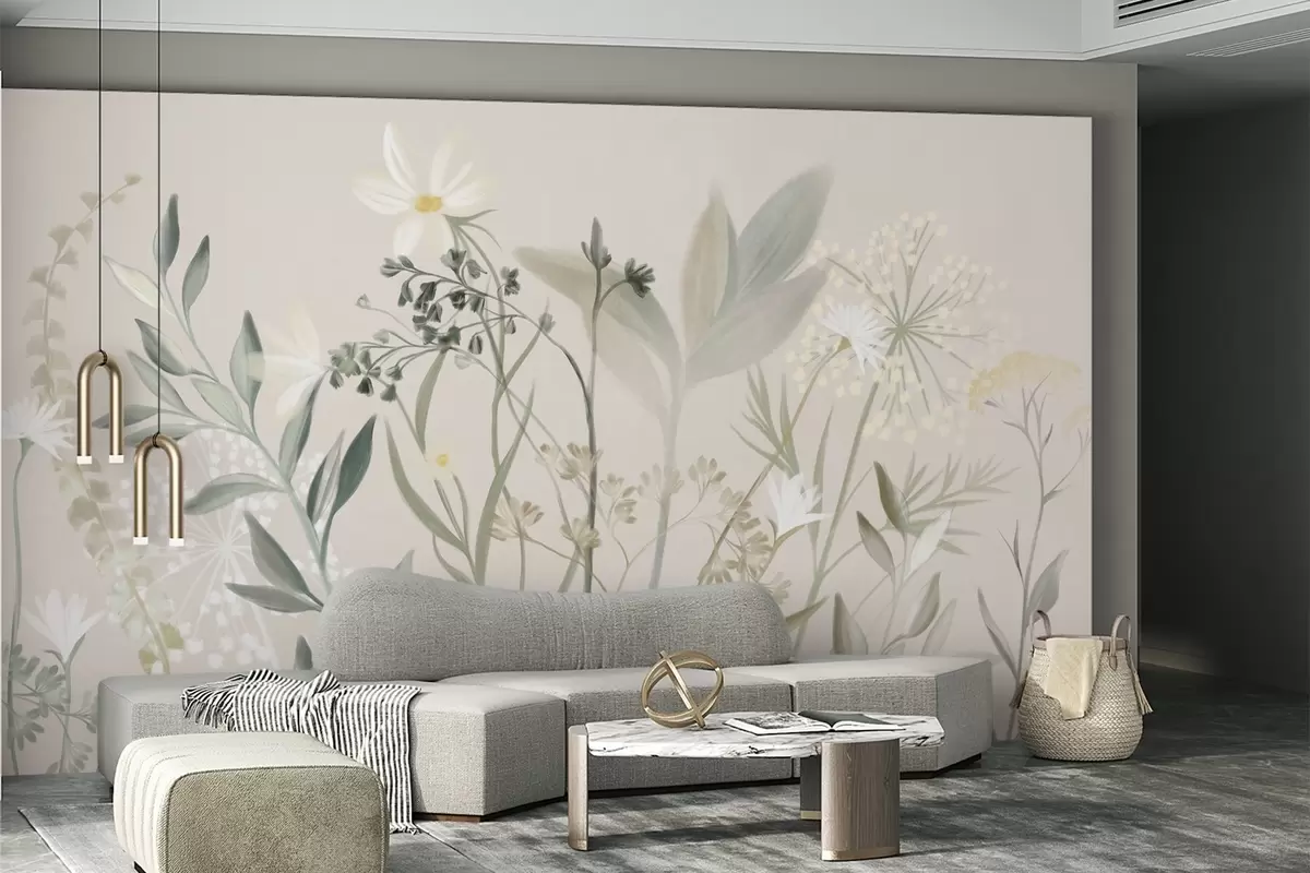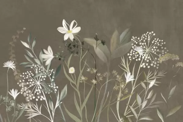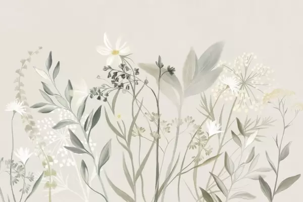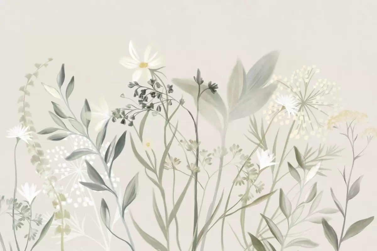 Peintures murales Fleurs sauvages et feuillage délicatement texturés dans des tons verts et crème discrets sur un fond beige clair. Nr. w09641