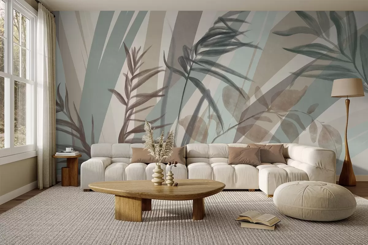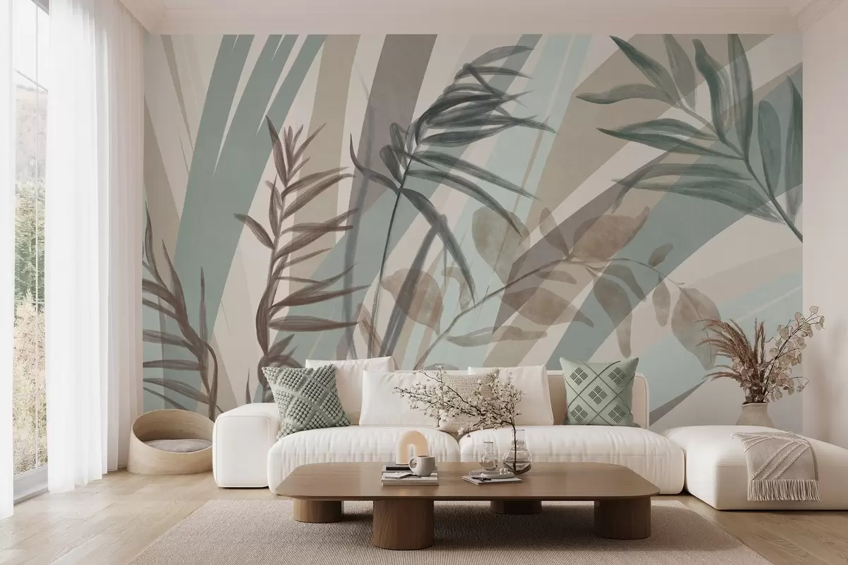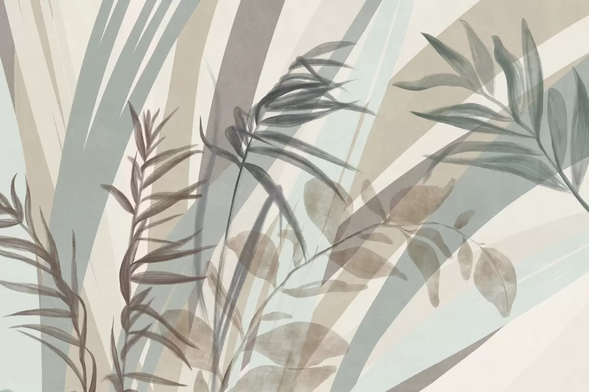 Peintures murales Hautes herbes texturées et feuilles dans des tons terreux discrets, avec des lignes abstraites en arrière-plan, créant un imprimé organique. Nr. w09643