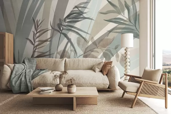 Peintures murales Hautes herbes texturées et feuilles dans des tons terreux discrets, avec des lignes abstraites en arrière-plan, créant un imprimé organique. Nr. w09643