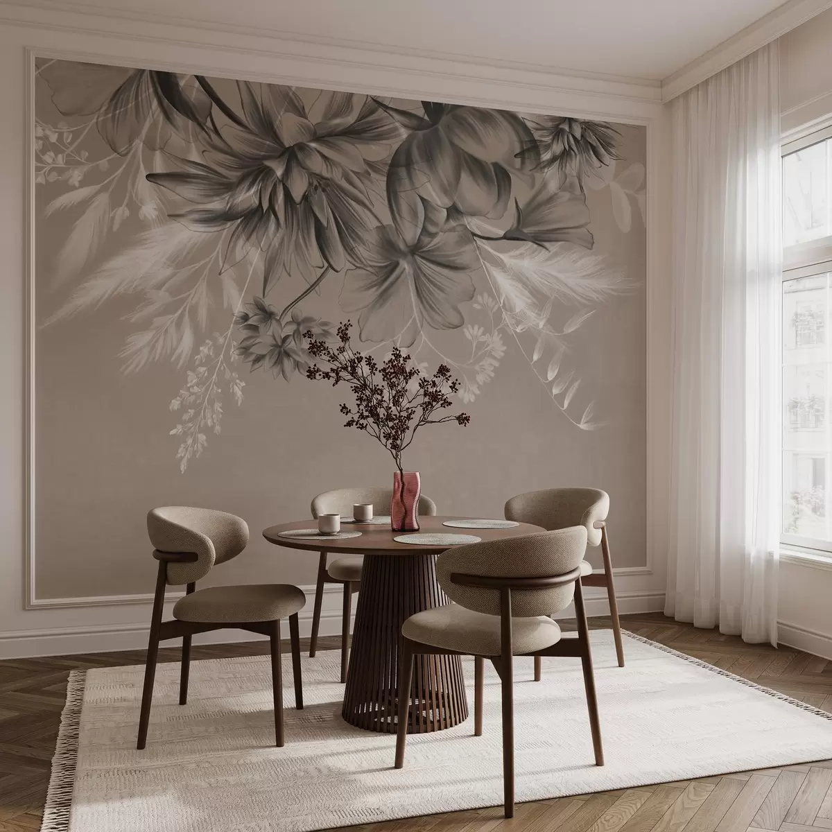 Peintures murales Fleurs et fougères texturées dans des tons gris foncé et blanc sur un fond beige discret, style dessin Nr. w09644
