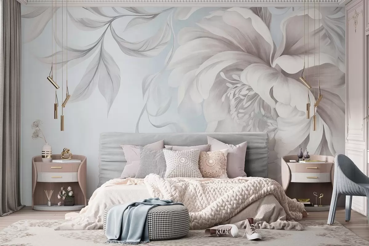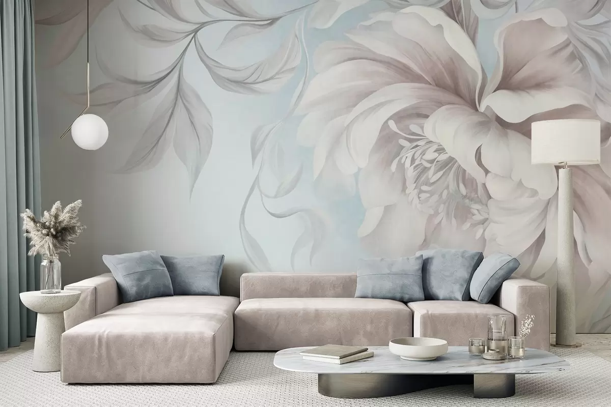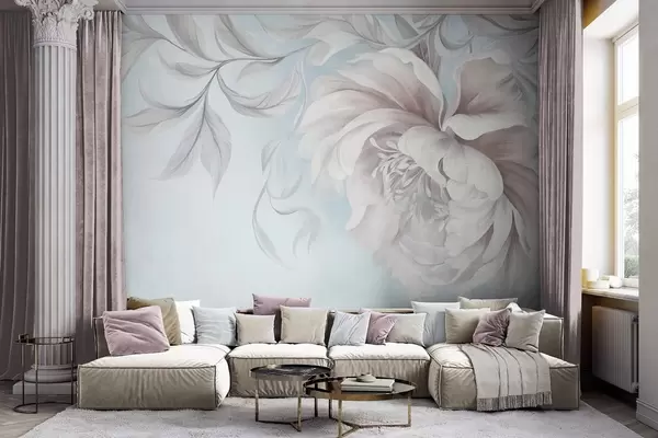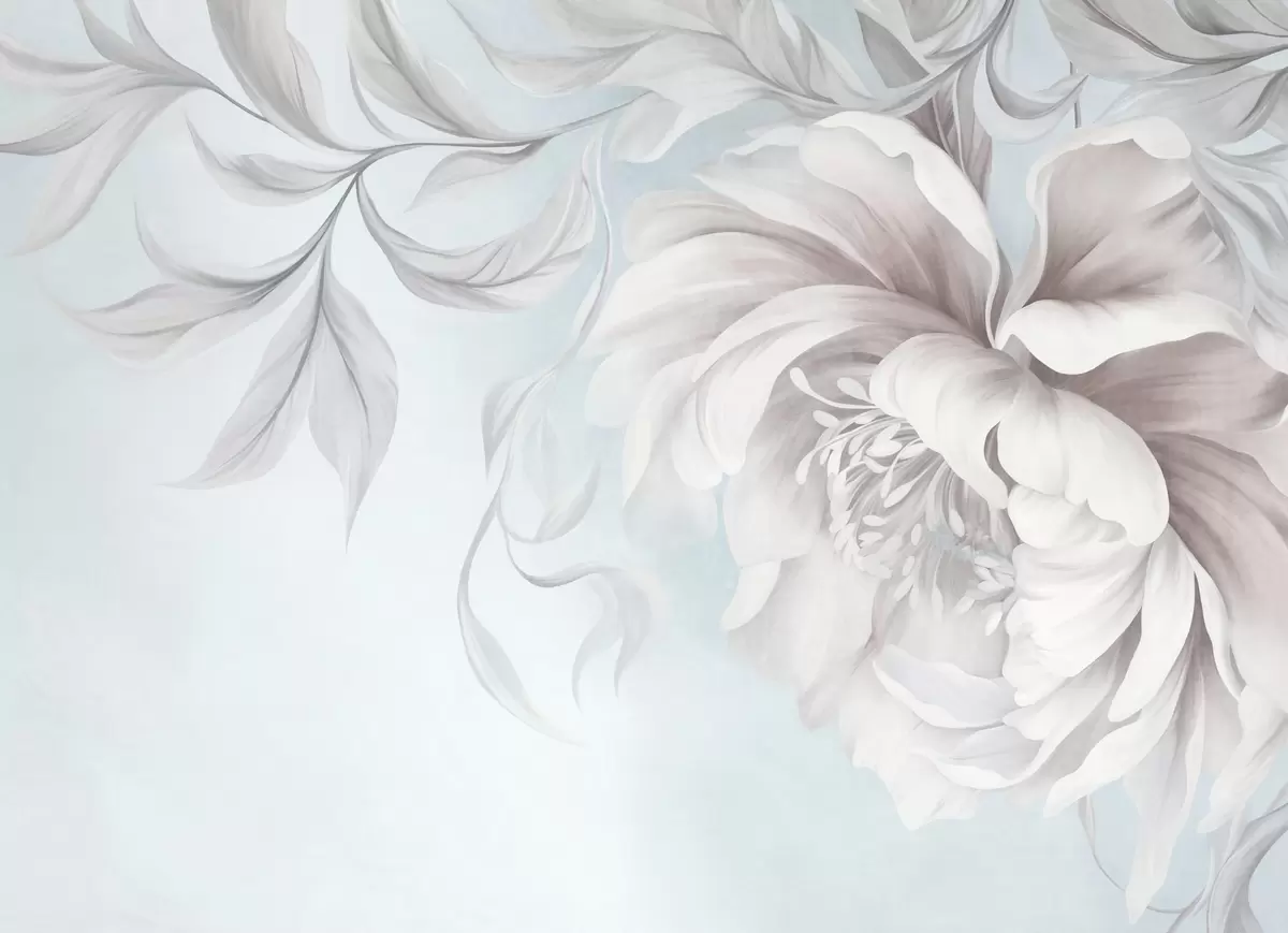 Peintures murales Grande pivoine texturée aux pétales délicats et aux feuilles grises, peinte dans un style doux Nr. w09647v1