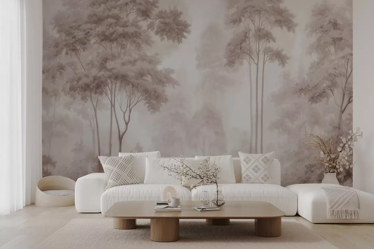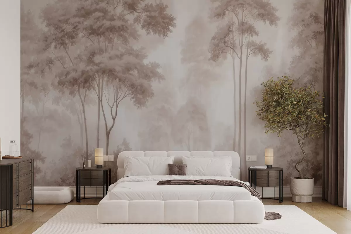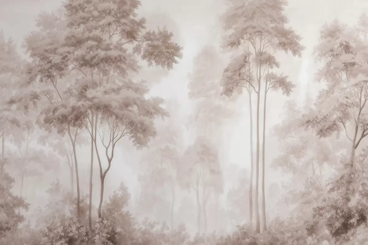 Peintures murales Paysage forestier abstrait dans des tons beige fumé, créant une impression de profondeur Nr. w09657