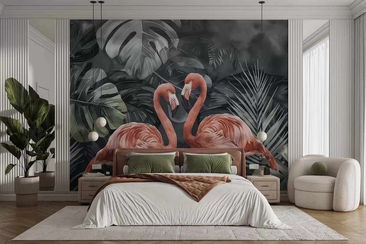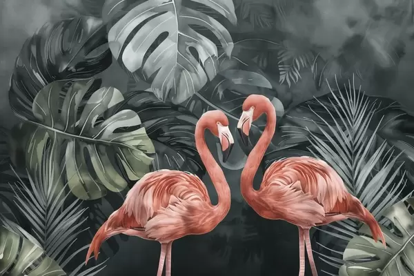 Peintures murales Un couple de flamants roses parmi des plantes tropicales Nr. w09687